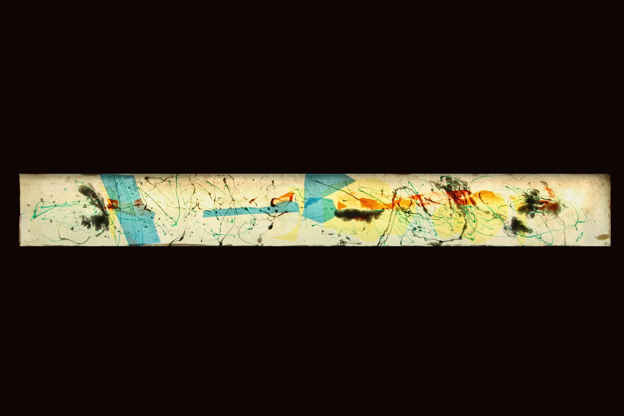 Un dessin et des lignes vertes et noires sur un décor bleu, jaune et orange sur fond blanc.