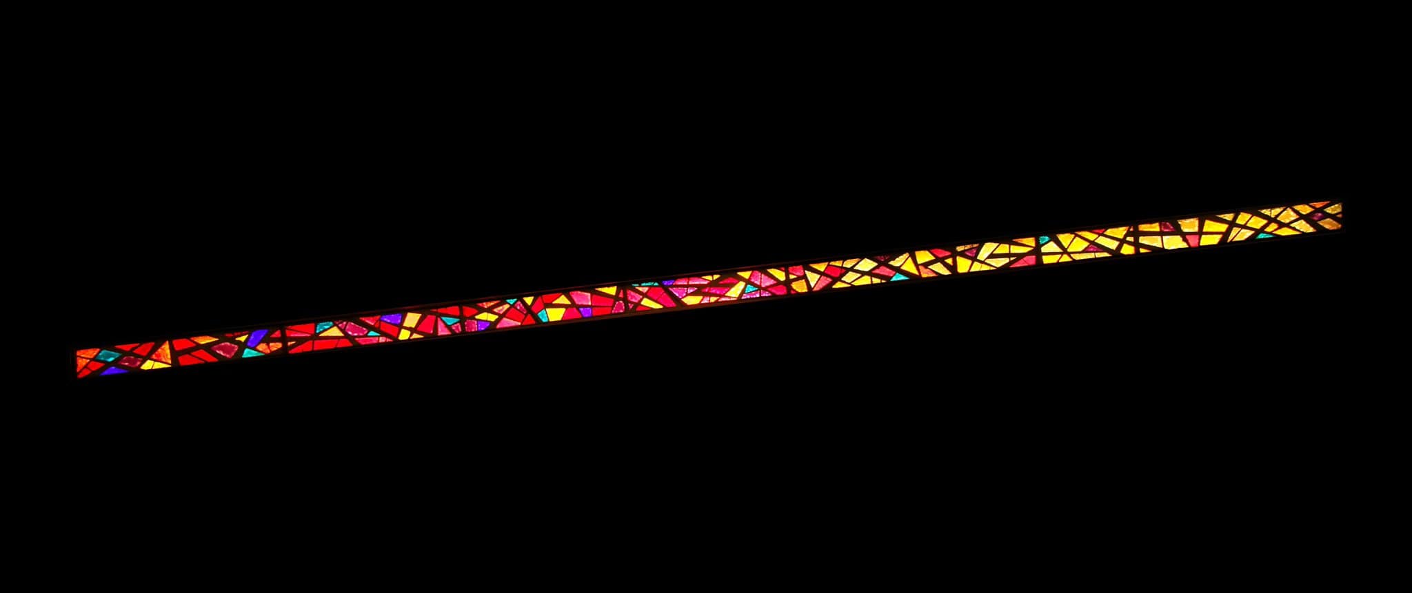 Bande de verre non figurative aux teintes dominantes rouge, orange et jaune.