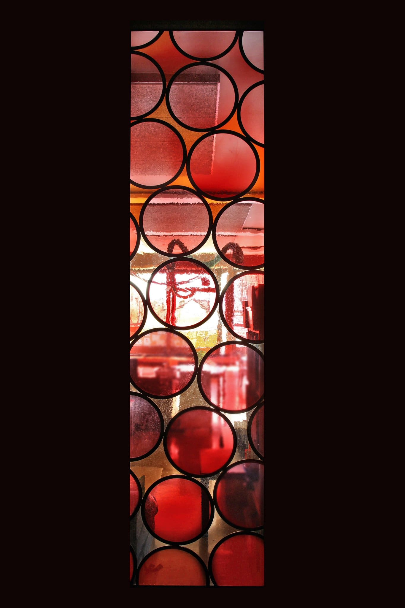 Un panneau décoratif composé de ronds rouges et roses sur fond jaune et orange.