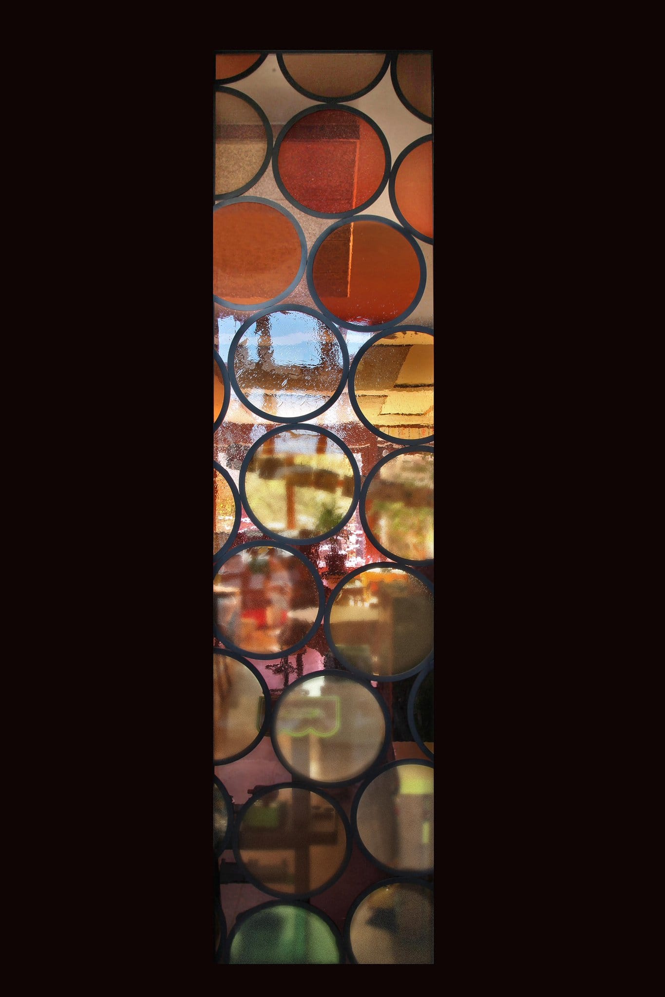 Un panneau décoratif composé de ronds bruns, jaunes et verts sur fond beige et rose.
