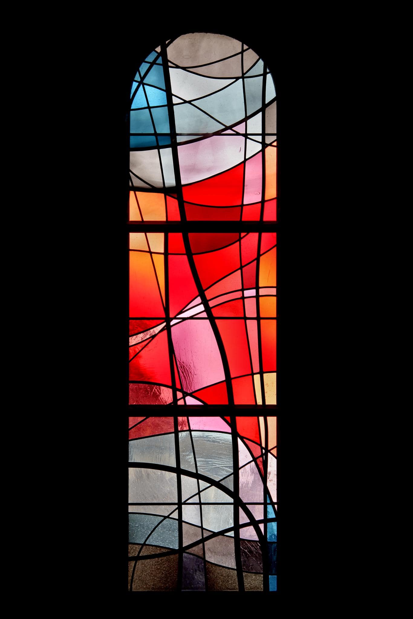 Vitrail non figuratif où les plombs d’épaisseurs différentes apportent une animation rythmique alors que les verres rouges dominent le centre et les verres gris, bleus et bruns en haut et le bas.