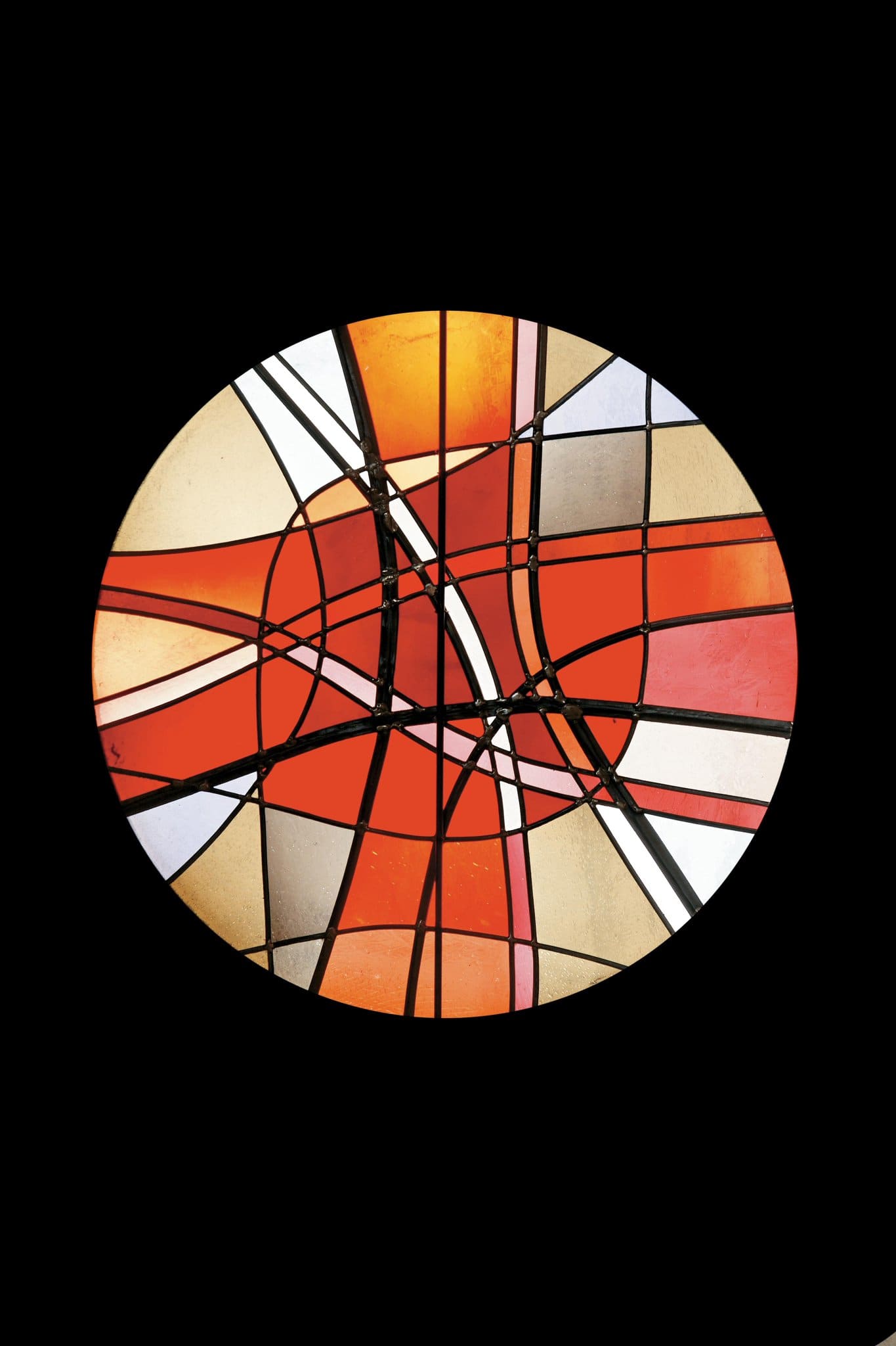 Vitrail non figuratif où les plombs d’épaisseurs différents apportent une animation rythmique alors que les verres rouges et oranges dominent l’ensemble de la rosace.