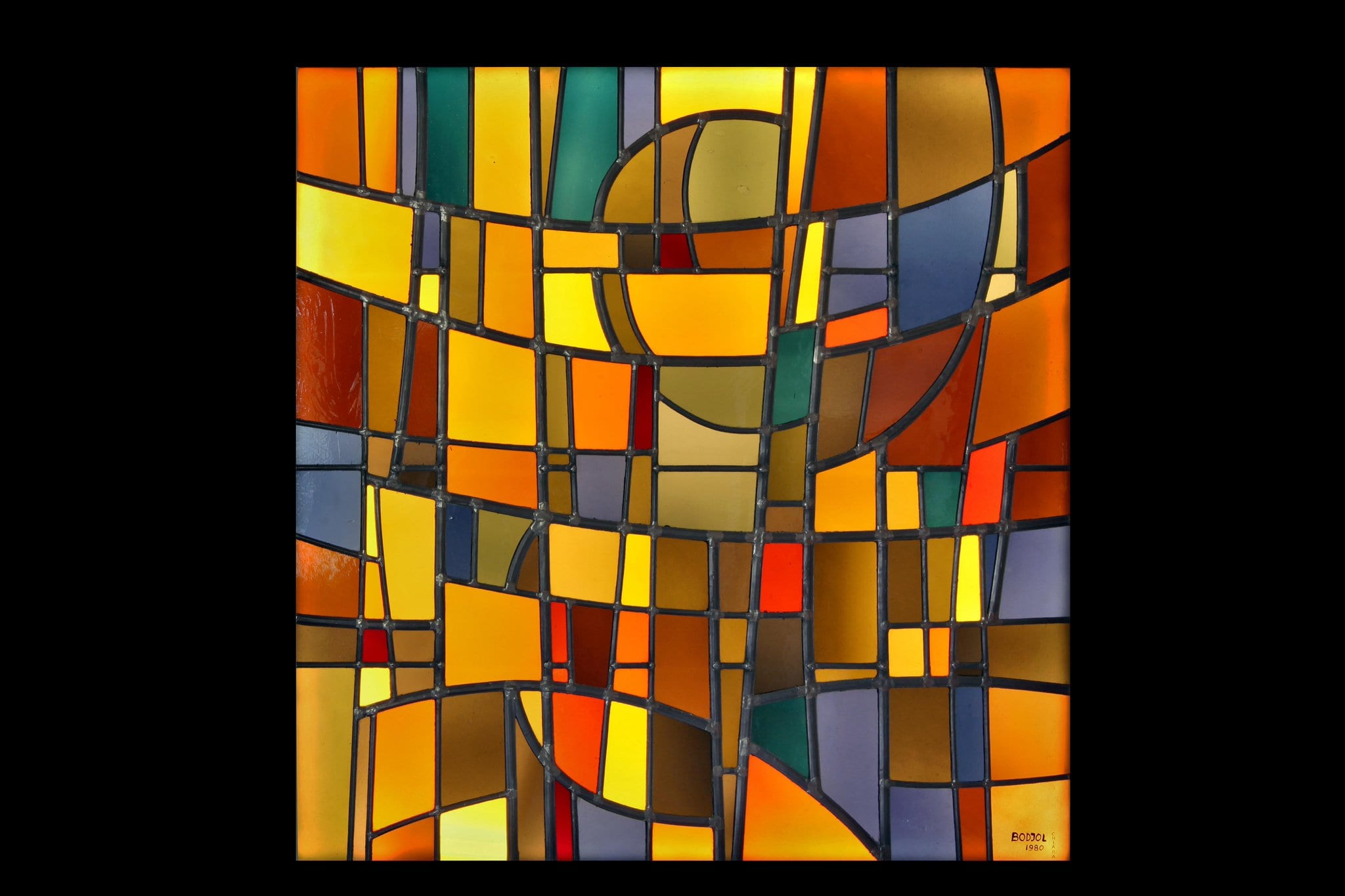 Vitrail non figuratif composé de teintes chaudes avec quelques verres bleus, gris et verts et aux ovales éclatés.