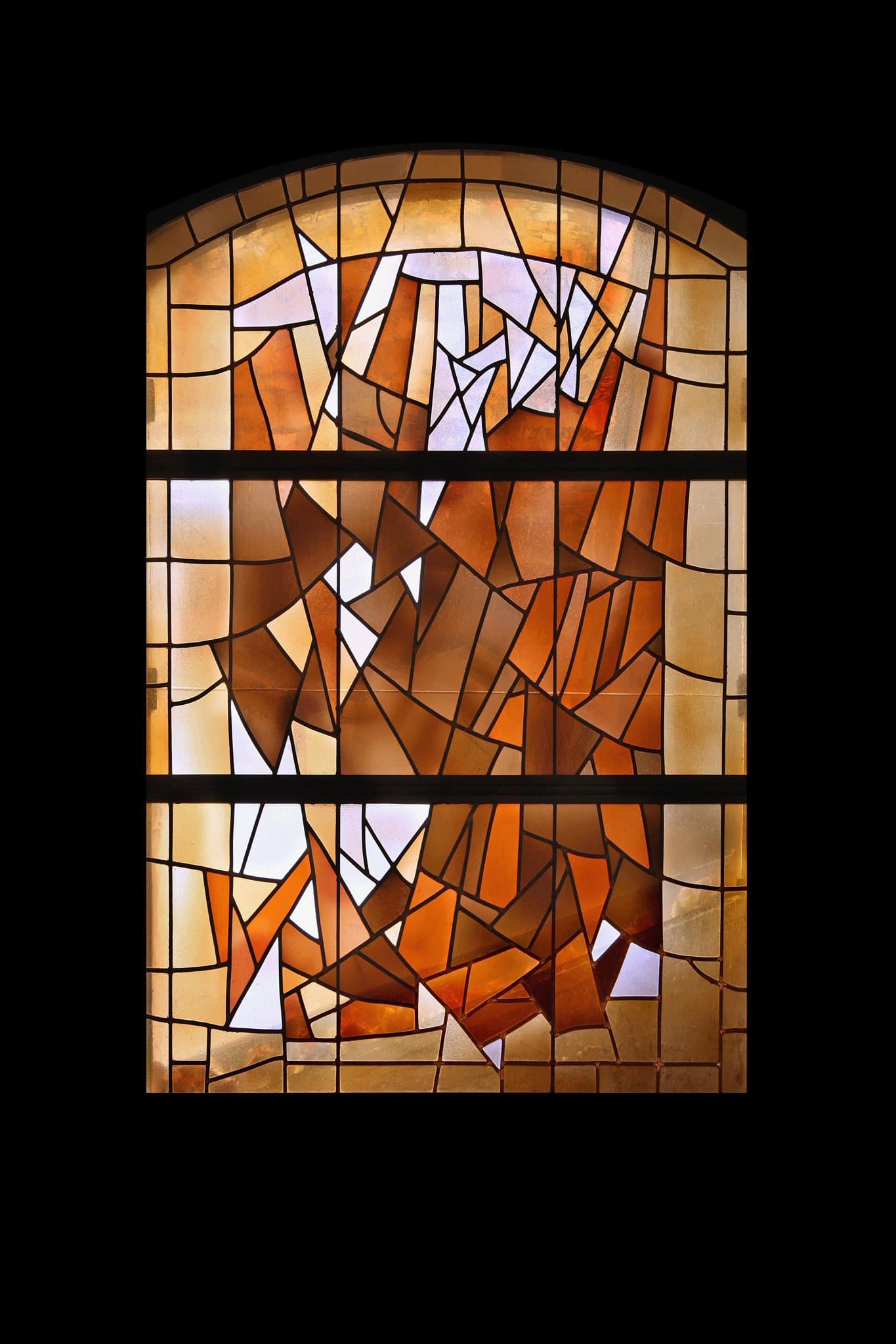 Vitrail non figuratif composé au centre de pièces de verre brunes et oranges dans un mouvement ascendant vers la droite et des pièces blanches au sommet. Le tout entouré d’une bordure beige.