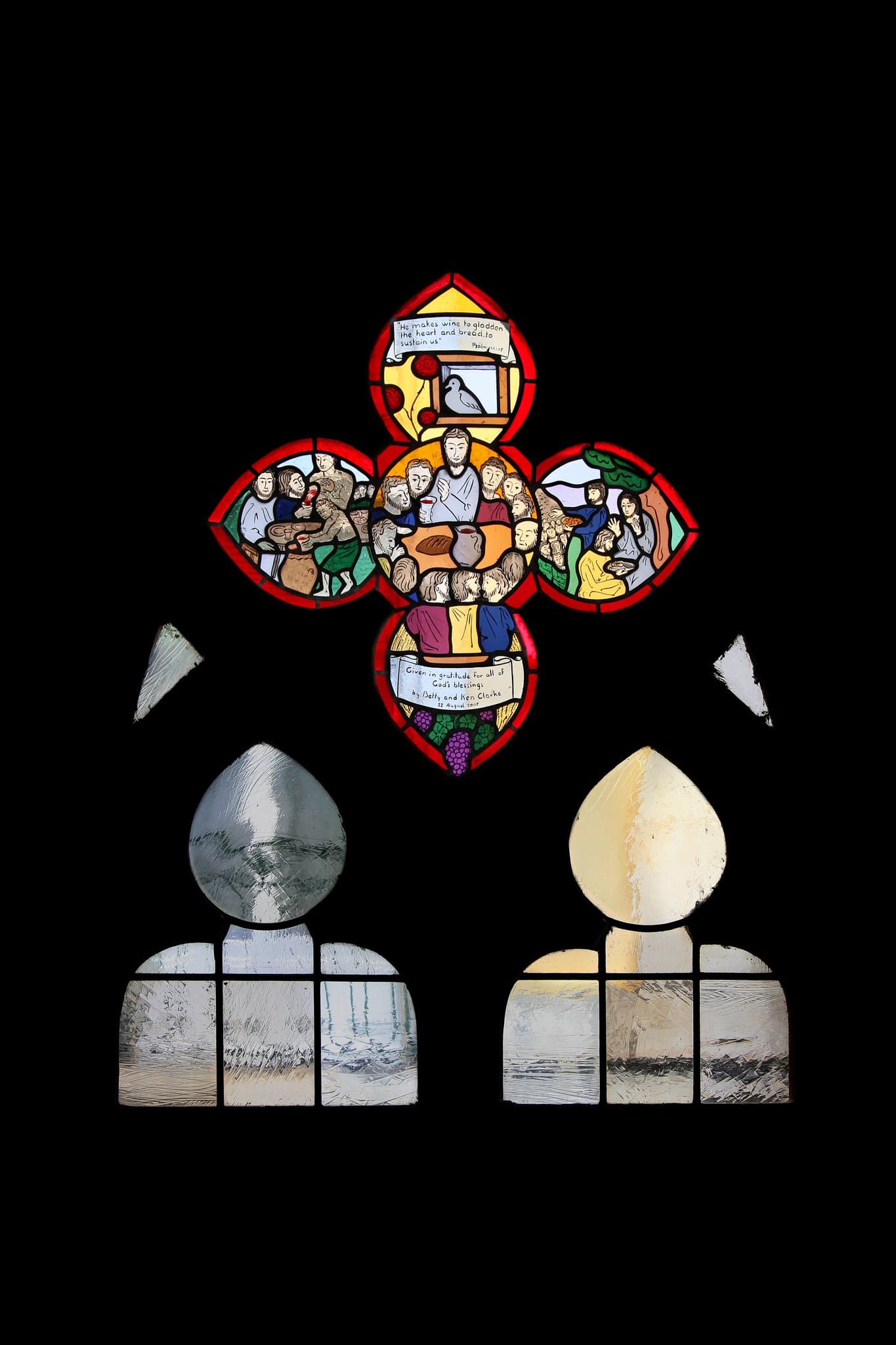 A gauche, des serviteurs servent du vin au Christ alors que les jarres sont pleines. Au centre, le Christ, entouré des douze apôtres tient un verre de vin. Sur la table du pain et une cruche. A droite, Jésus distribue le pain à la foule alors que derrière lui un disciple tient un plat avec deux poissons. En haut, une colombe dans un encadrement et des roses.