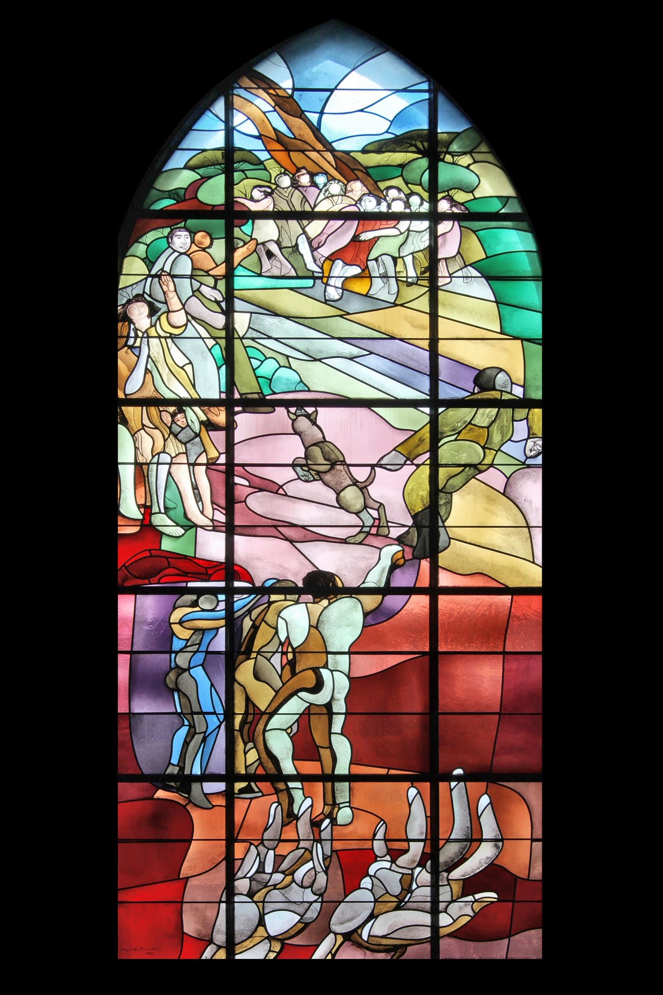 Au premier plan des mains ouvertes en signe de supplication symbolise la détresse des opprimés alors que le peuple, réparti en trois groupes, recule devant l’agression d’un soldat et son chien rugissant devant eux. Dans la partie supérieure, un tronc d’arbre se plie suivant le mouvement de recul du peuple.