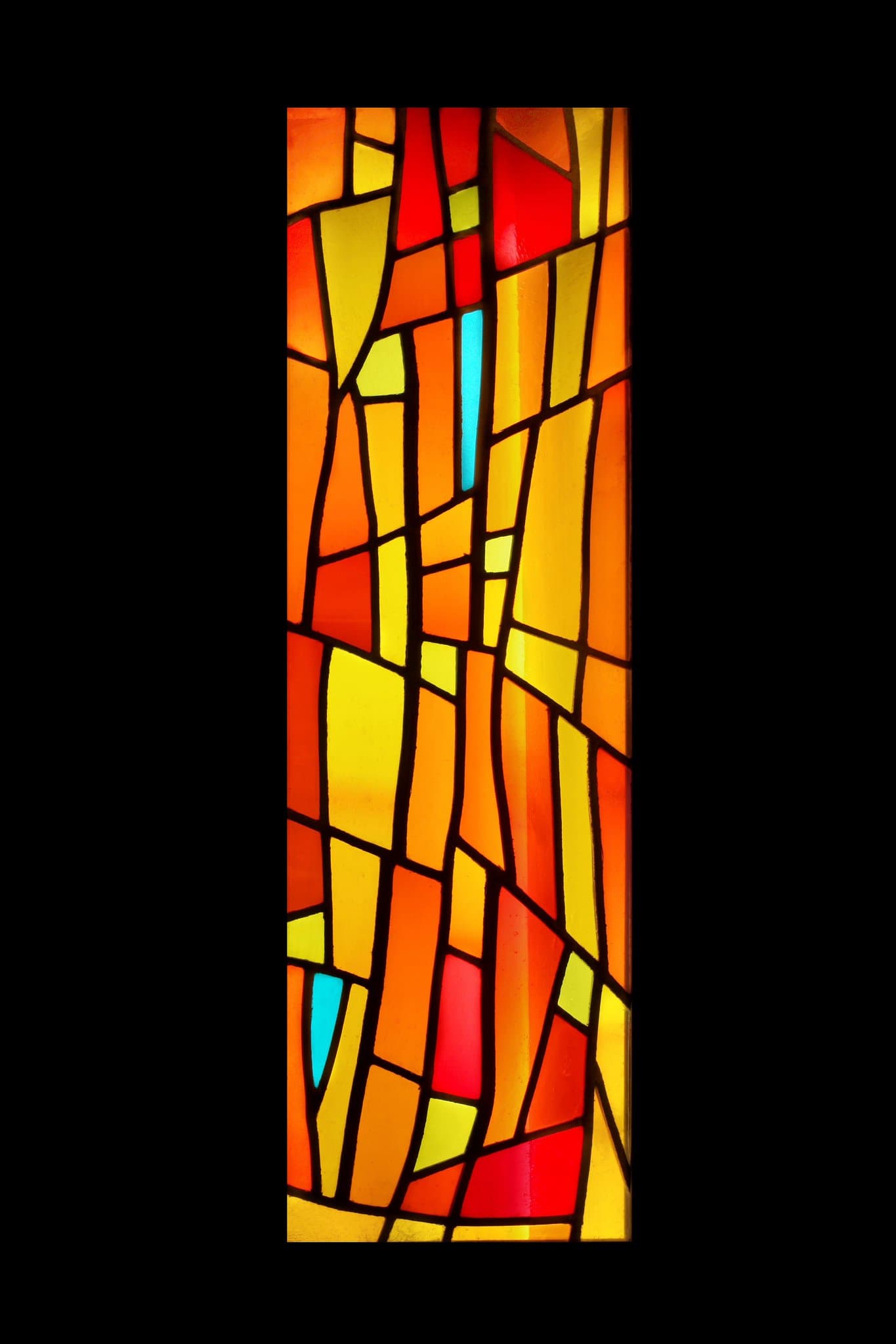 Vitrail non figuratif composé de tons chauds oranges, jaunes et rouges avec des touches de vert et de bleu.
