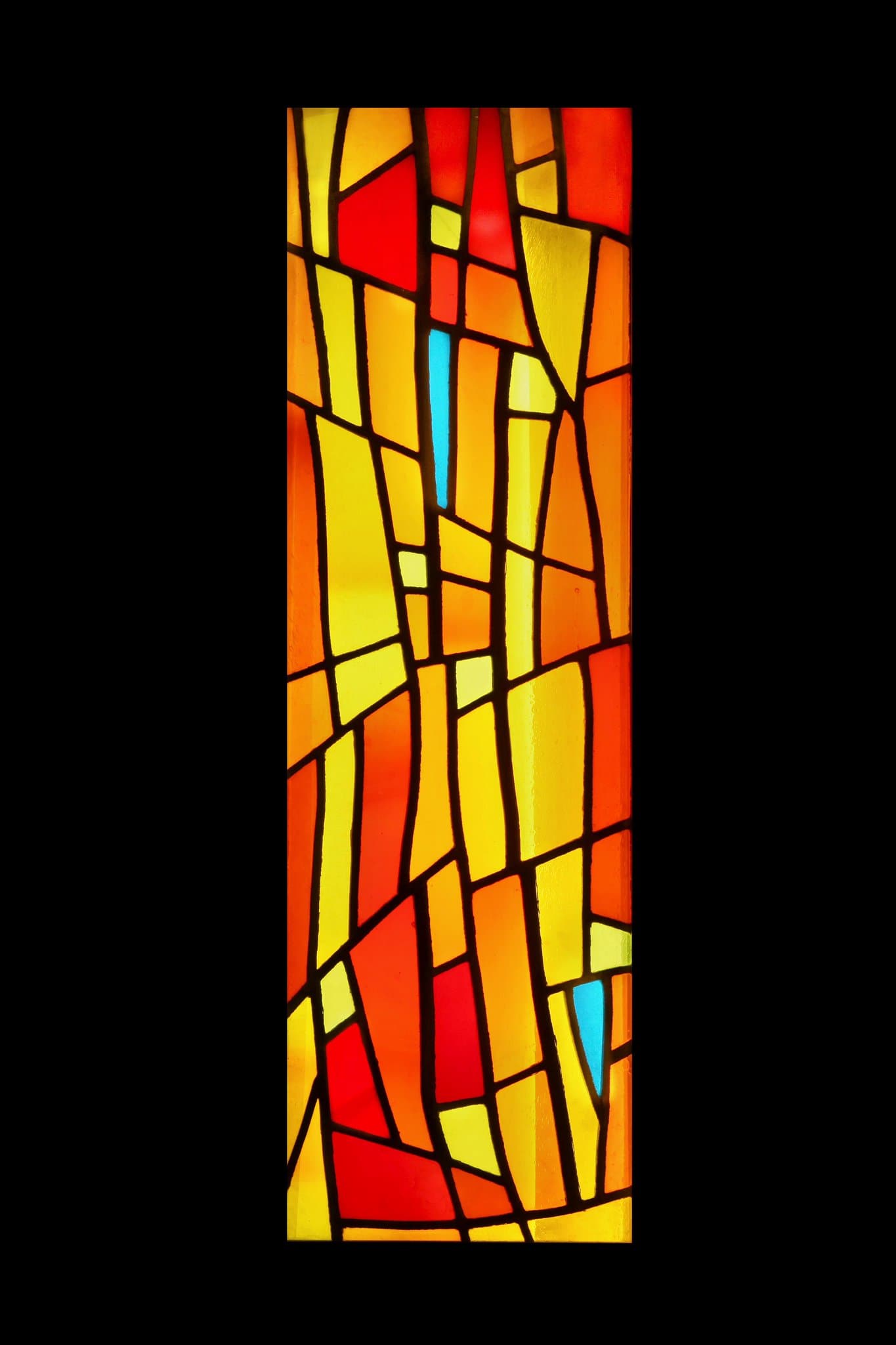 Vitrail non figuratif composé de tons chauds oranges, jaunes et rouges avec des touches de vert et de bleu.