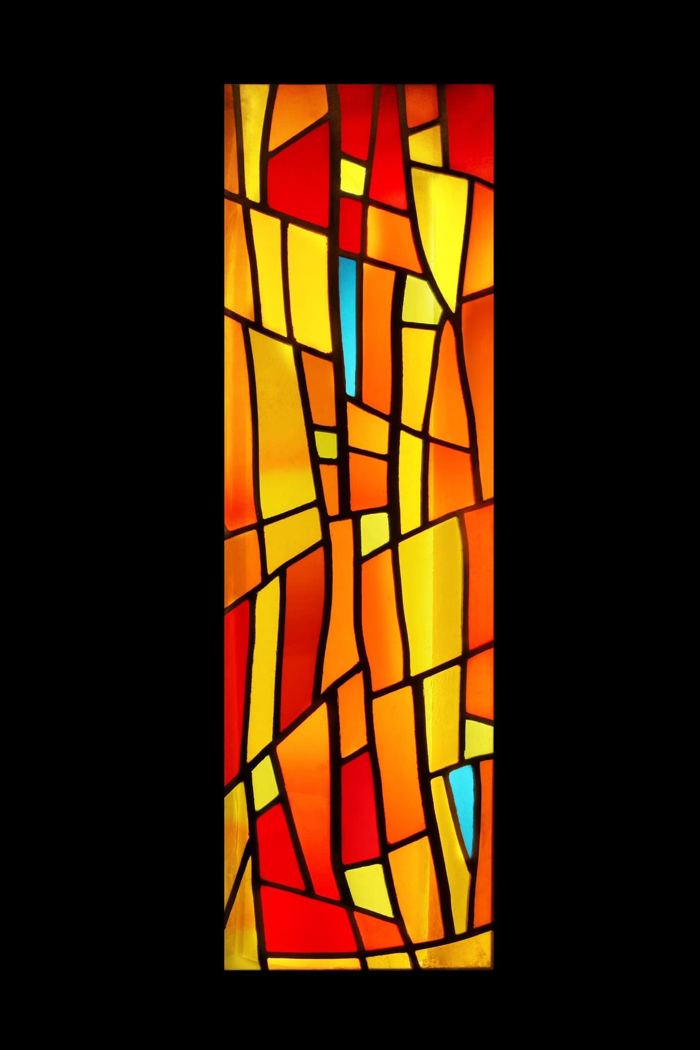 Vitrail non figuratif composé de tons chauds oranges, jaunes et rouges avec des touches de vert et de bleu.