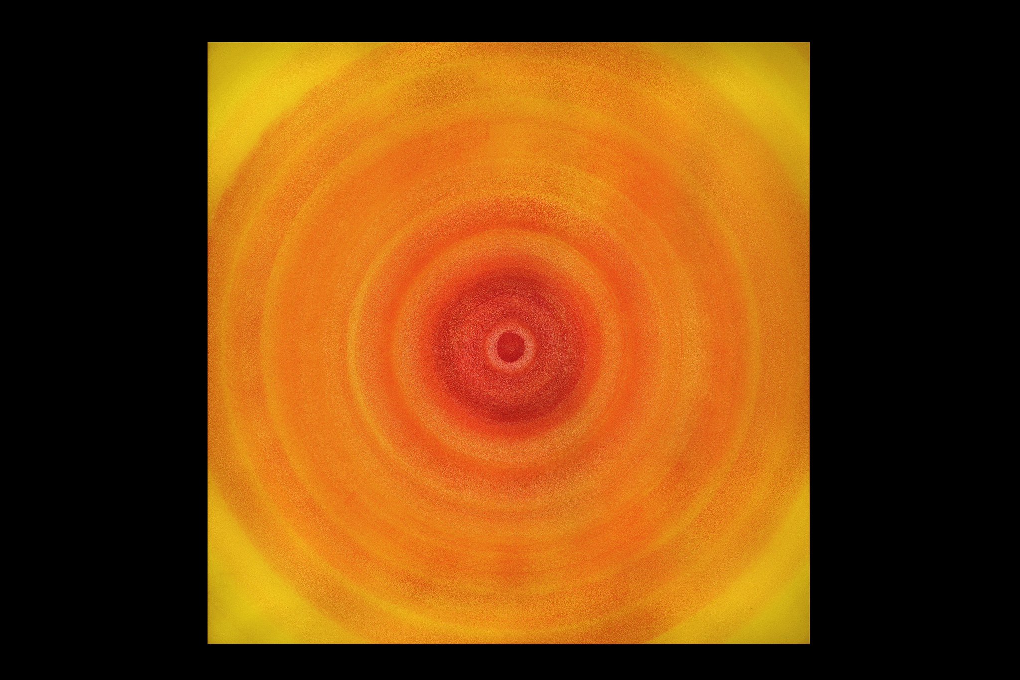 Tableau lumineux inspiré de l'arc-en-ciel. Grand cercle jaune, orange et rouge (de l'extérieur au centre).