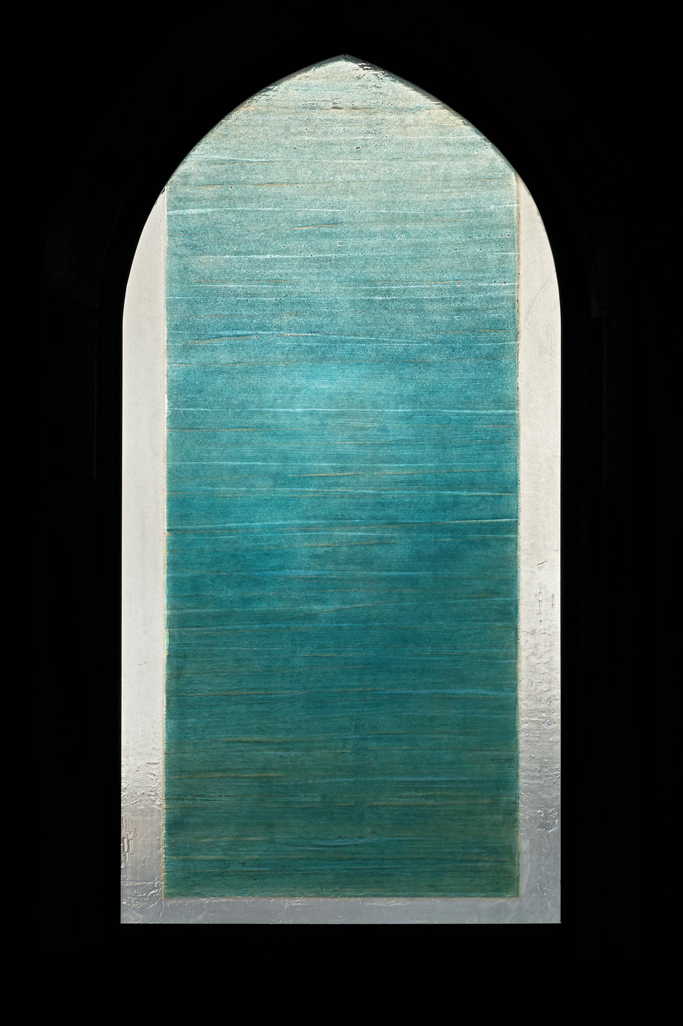 Vitrail non figuratif composé de teintes bleues, turquoises et vertes striées de lignes horizontales alors qu’une bande blanche se déploie sur les côtés et le bas de la fenêtre.