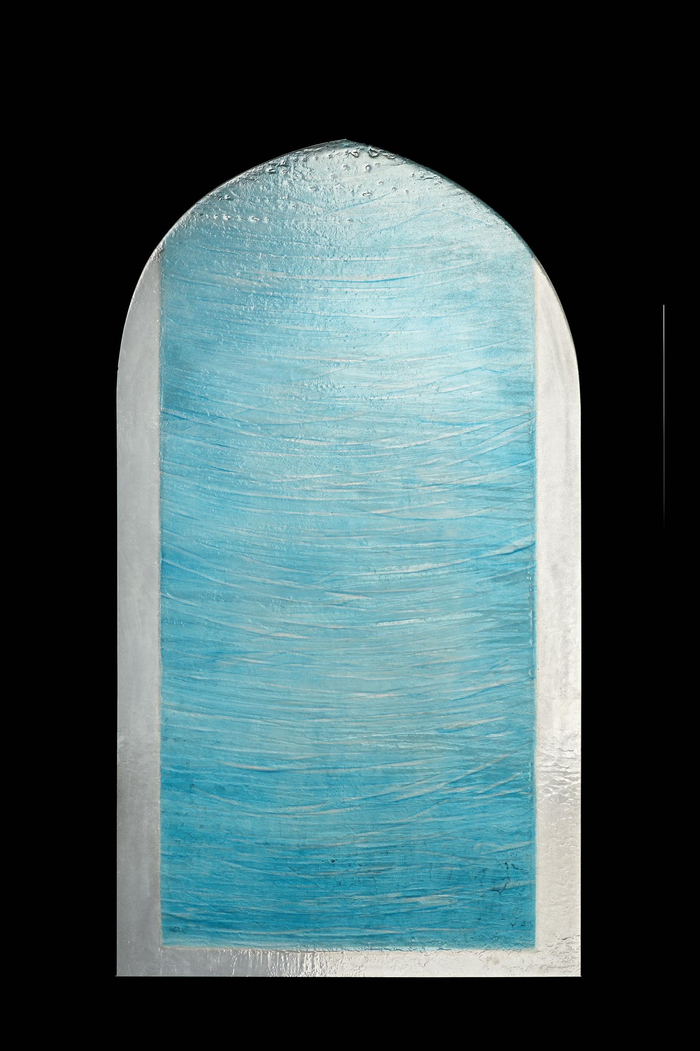 Vitrail non figuratif composé de teintes bleues et blanches et de lignes ondulantes suggérant l’eau.