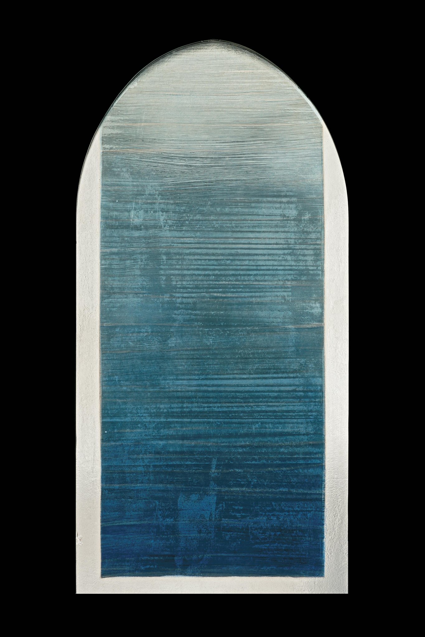 Vitrail non figuratif composé de teintes bleues nuit, bleues de prusse et grises et striées de lignes horizontales alors qu’une bande blanche se déploie sur les côtés et le bas de la fenêtre.