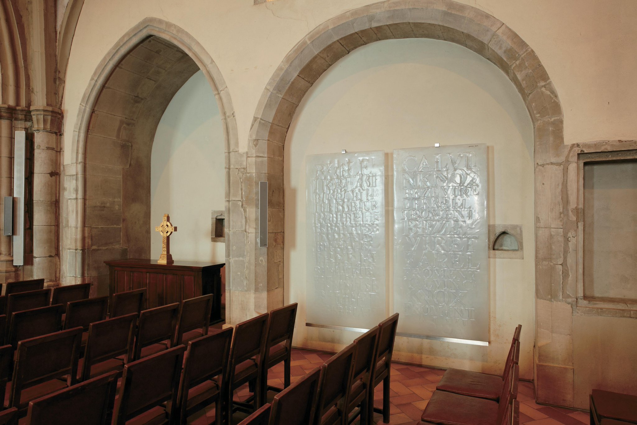 Deux panneaux accrochés à distance du mur s’ouvrent vers le haut dans un geste qui rappelle l’ouverture d’un livre. Des mots et des phrases liés au christianisme de la Réforme s’y déploient ,parfois superposés.