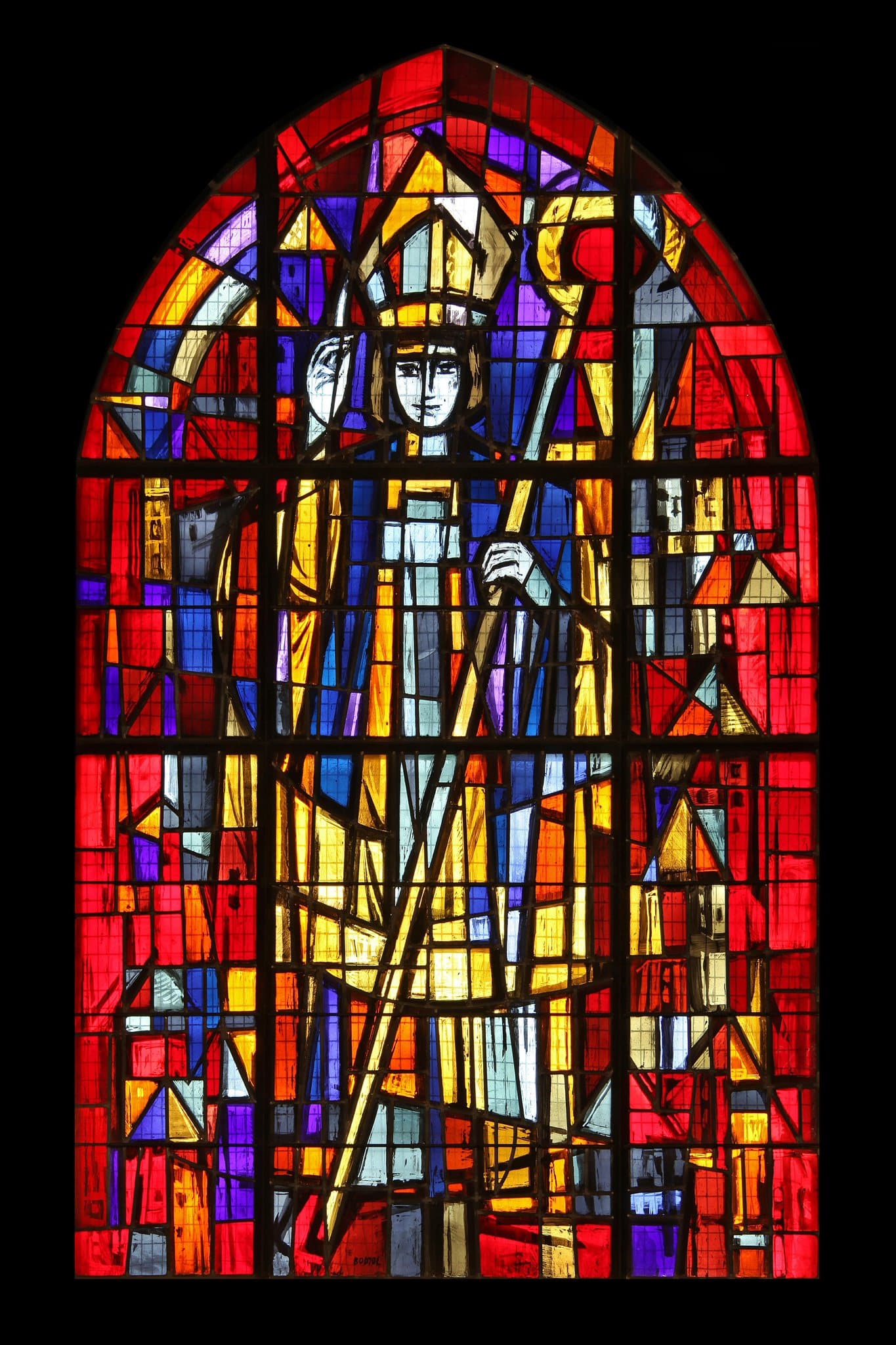 Saint Germain d’Auxerre, habillé en évêque, est debout et fait un signe de bénédiction de sa main droite alors que de la gauche il tient une crosse. De chaque côté des maisons évoquent les villes qu’il a converties.