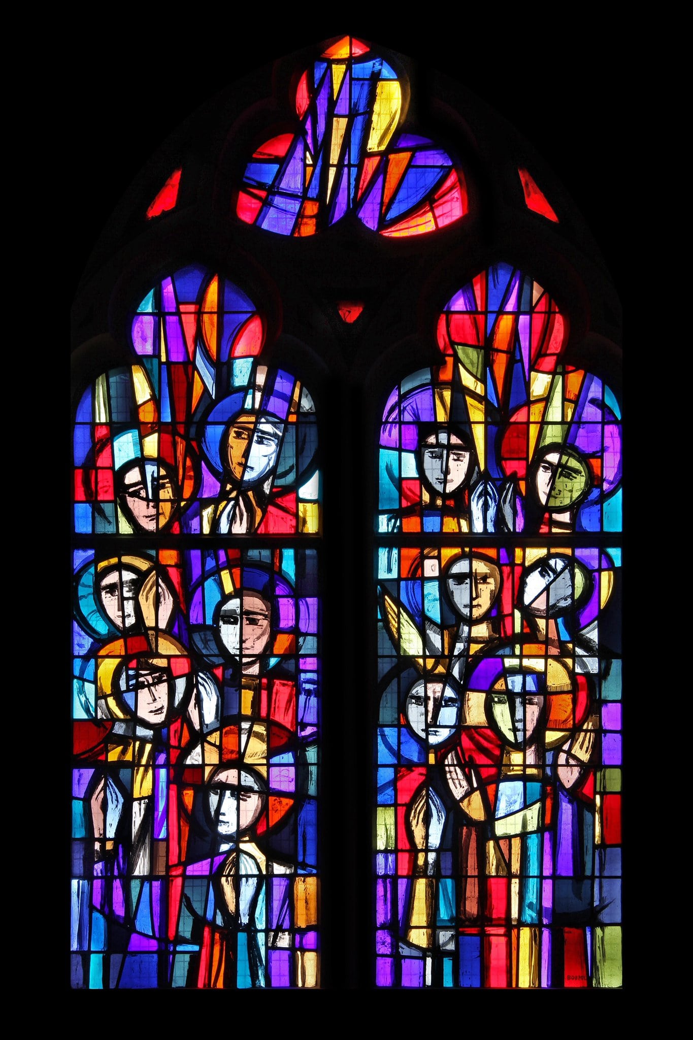 Douze apôtres, les mains jointes ou ouvertes, sont répartis sur les deux lancettes et reçoivent L’Esprit Saint descendant du ciel sous la forme de langues de feu.