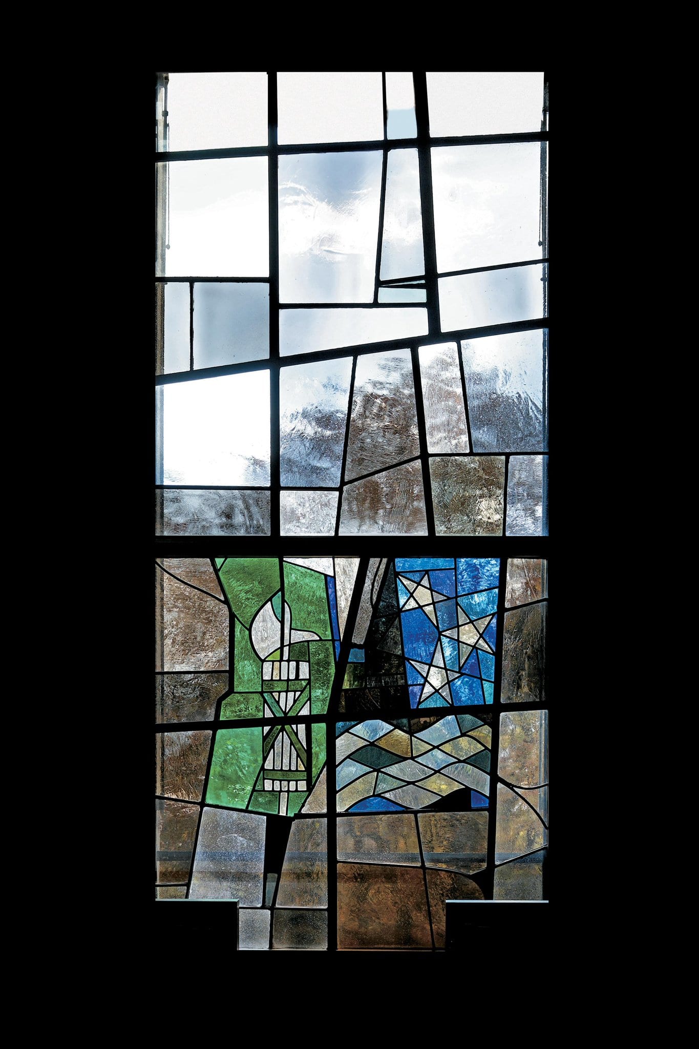 Les armoiries de Saint-Gall et d’Argovie sont côte à côte dans la partie inférieure de la fenêtre composée de verres clairs.