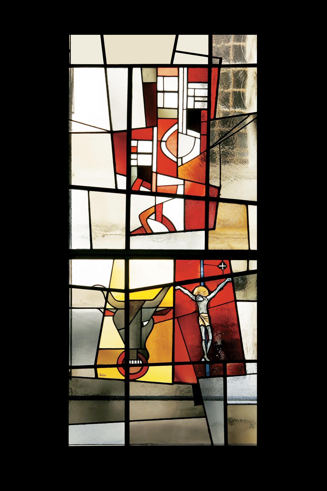 En haut, les armoiries d’Unterwald, en bas celles de Uri et Schwytz insérées côte à côte au centre de la fenêtre composée de verres clairs.