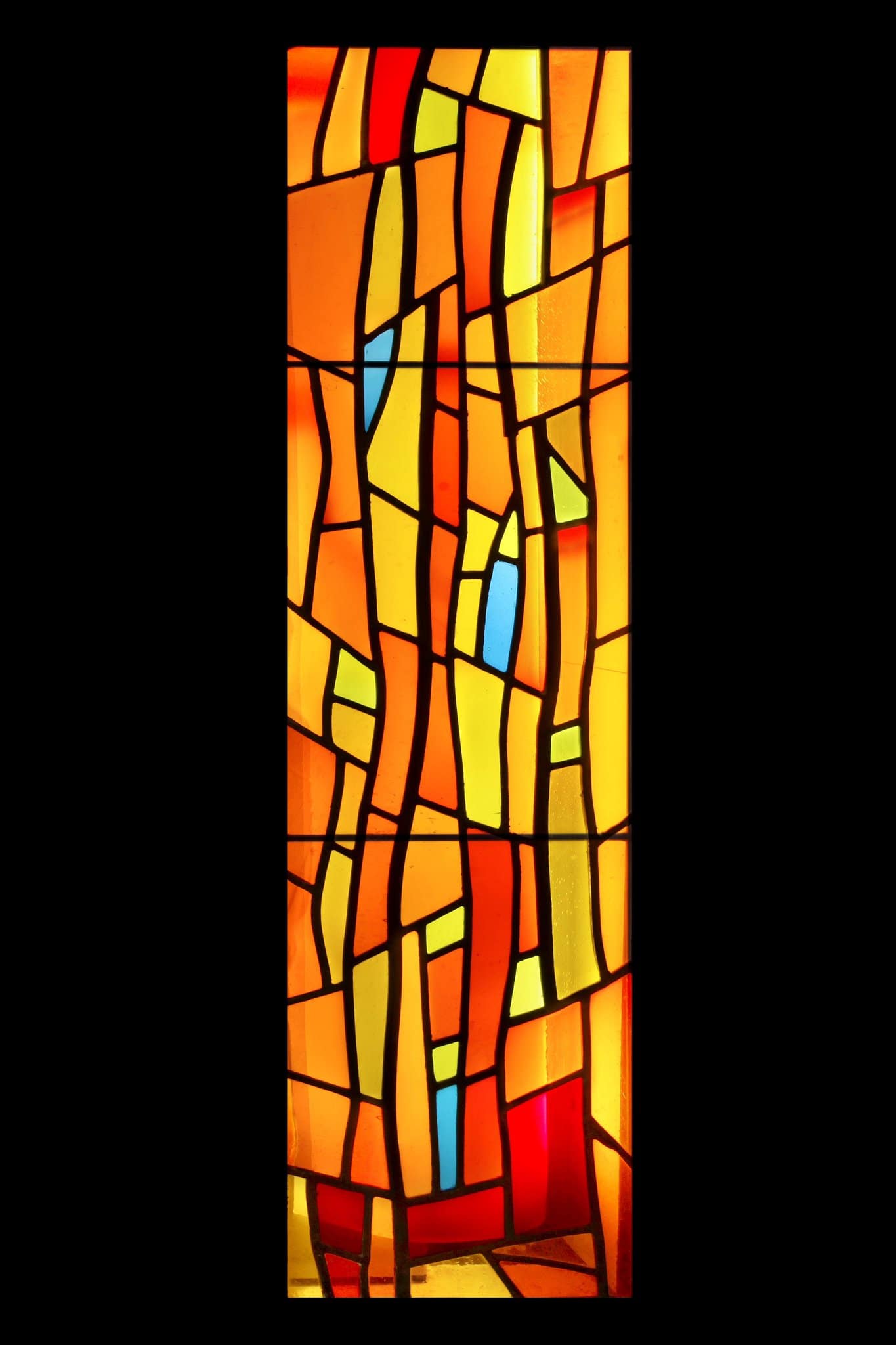 Vitrail non figuratif composé de tons chauds oranges, jaunes et rouges avec des touches de vert et de bleu.