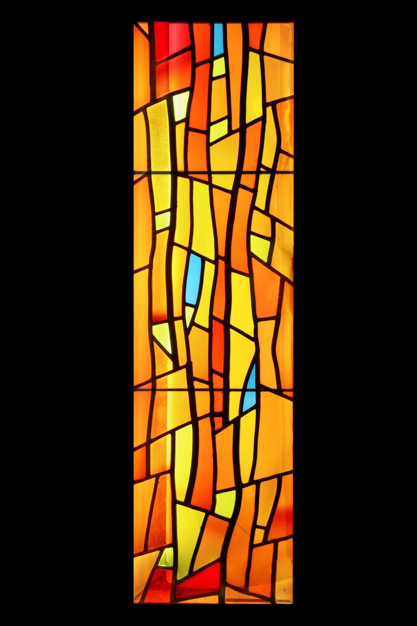 Vitrail non figuratif composé de tons chauds oranges, jaunes et rouges avec des touches de vert et de bleu.