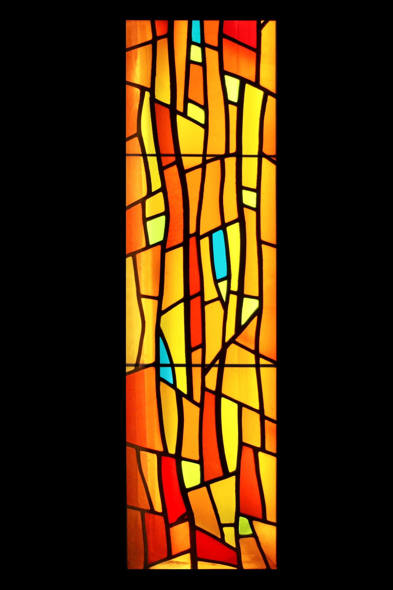 Vitrail non figuratif composé de tons chauds oranges, jaunes et rouges avec des touches de vert et de bleu.