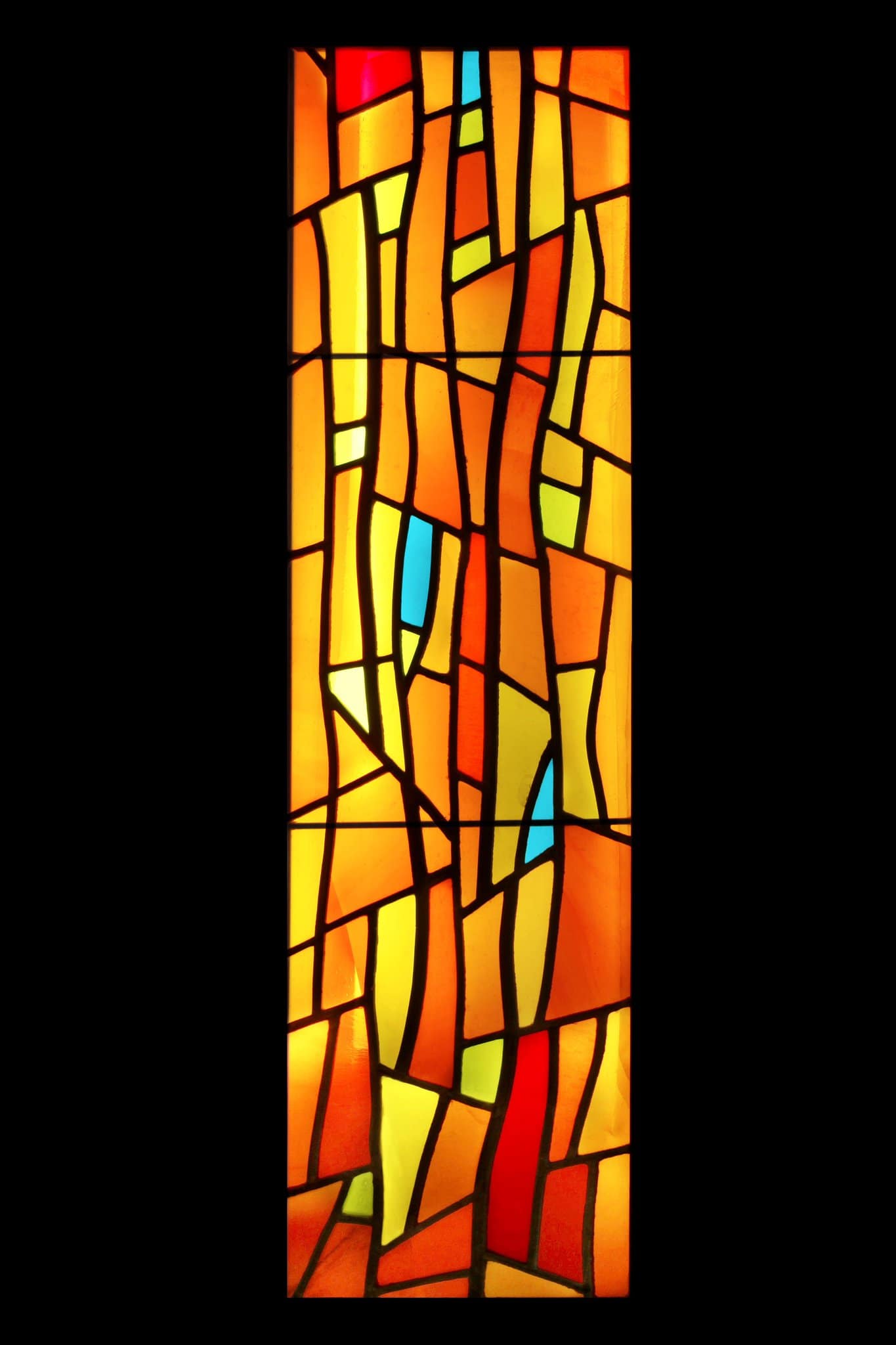 Vitrail non figuratif composé de tons chauds oranges, jaunes et rouges avec des touches de vert et de bleu.