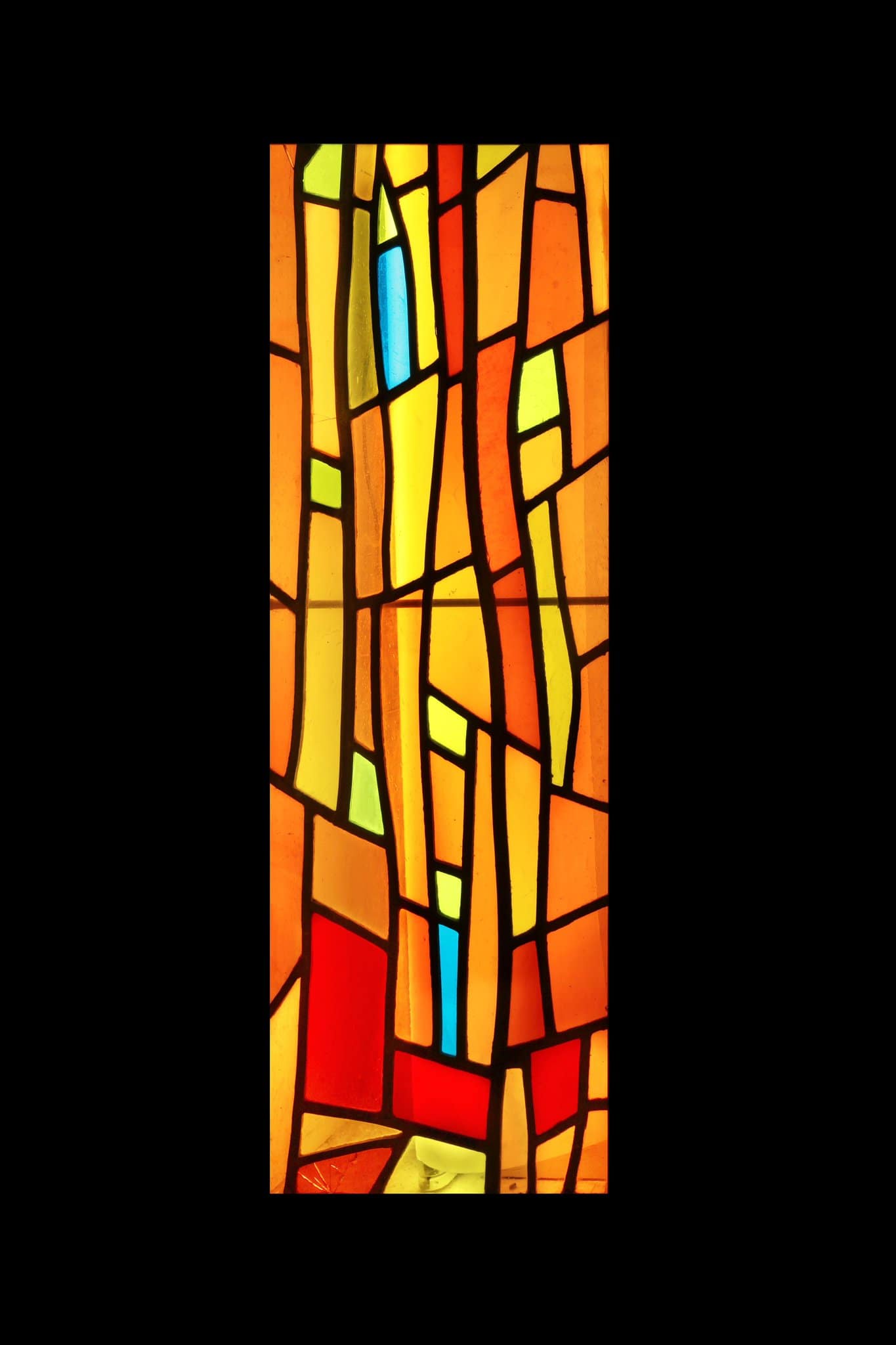 Vitrail non figuratif composé de tons chauds oranges, jaunes et rouges avec des touches de vert et de bleu.