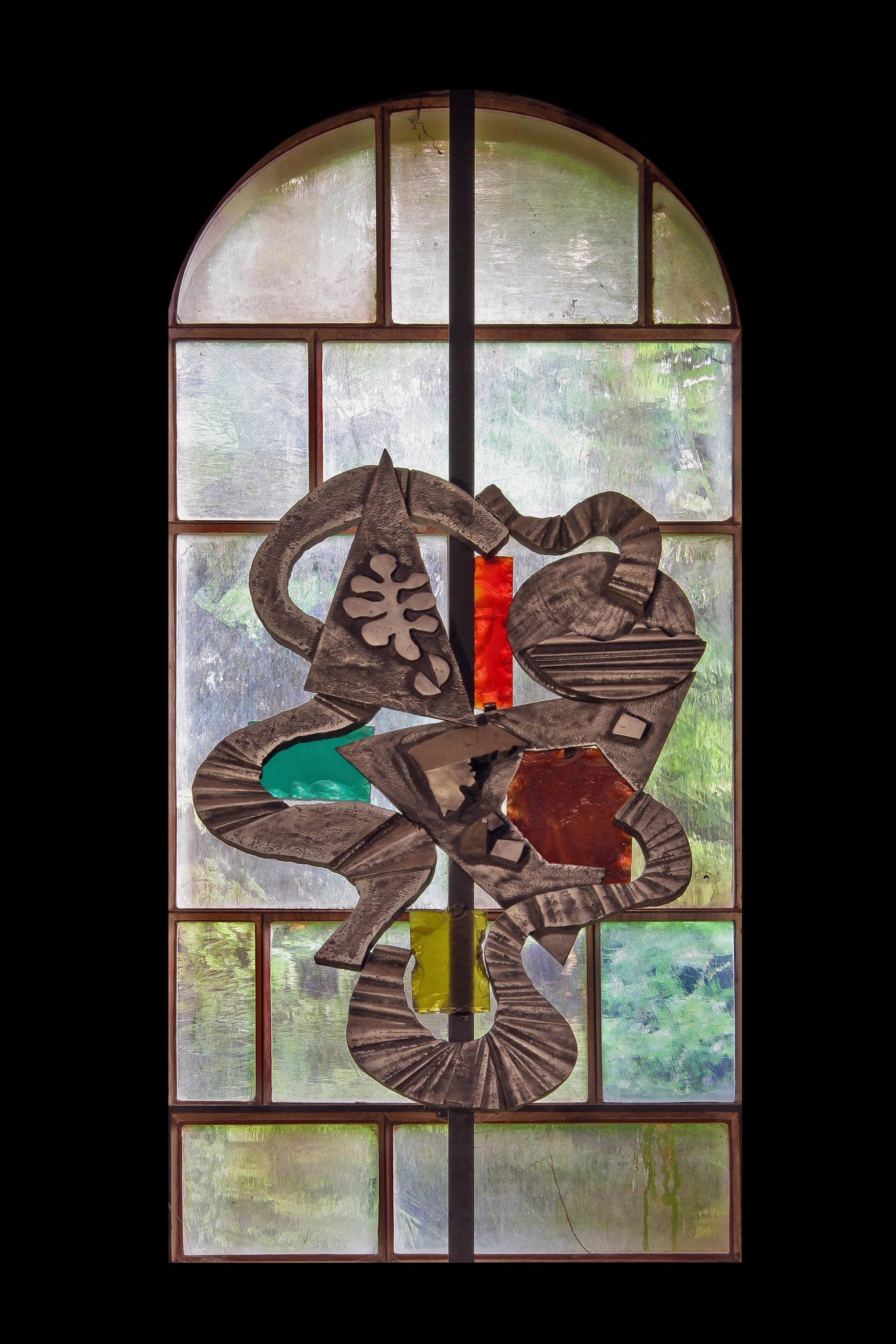Devant, un décor sculpté composé de différents éléments, feuille, soleil, champs, symbolisant la terre avec des incrustations de dalles de verre rouge, orange, jaune et verte montées sur une barre métallique. Derrière, une fenêtre de verre blanc mis en plomb.