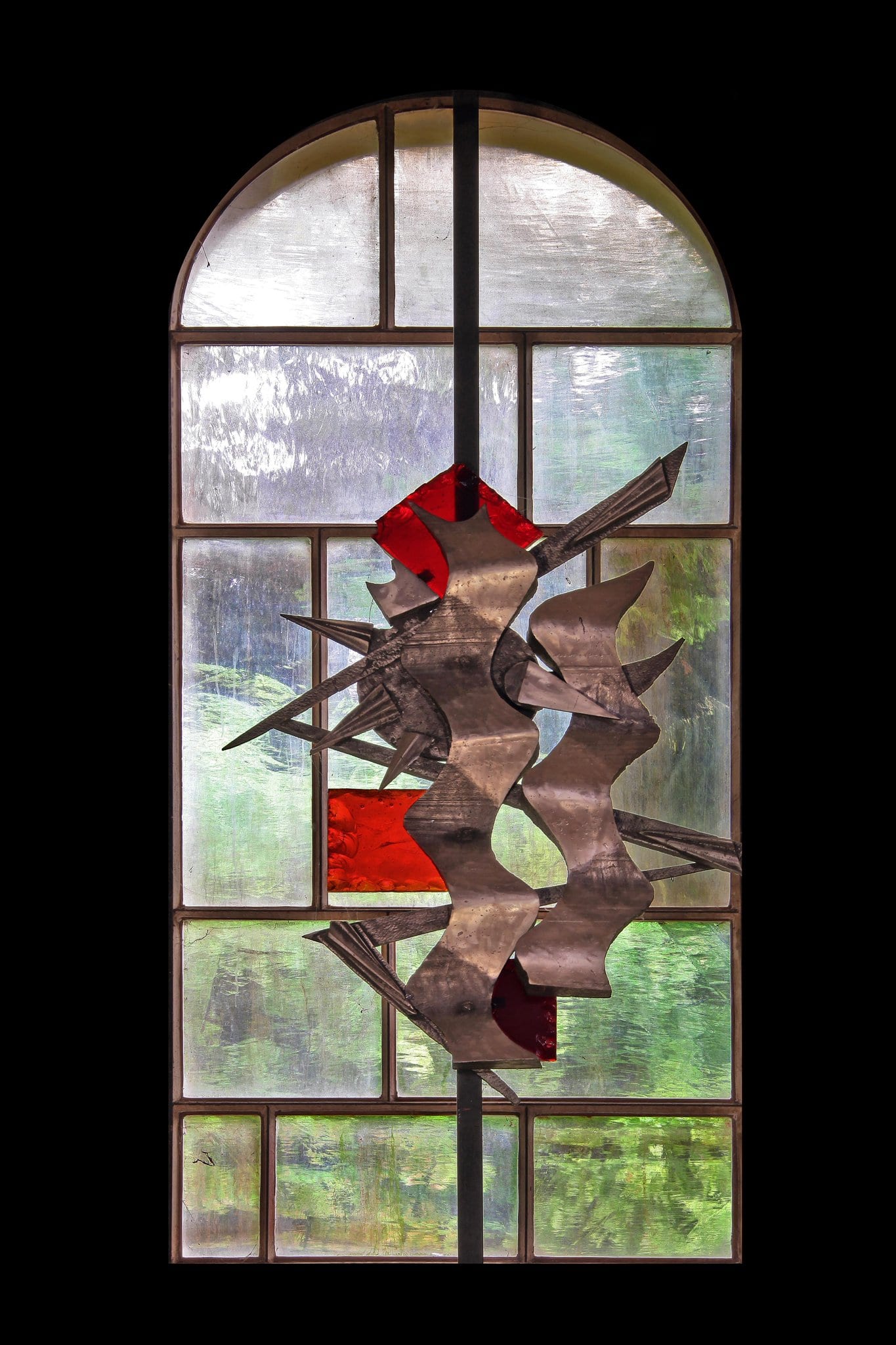 Devant, un décor sculpté composé d’éclairs et de flammes symbolisant le feu avec des incrustations de dalles de verre rouge montées sur une barre métallique. Derrière, une fenêtre de verre blanc mis en plomb.