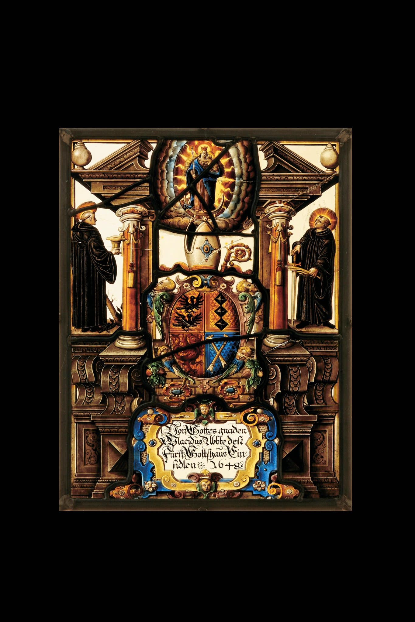 Les armoiries du monastère, écartelées de celles du prélat sont surmontées de la mitre et de la crosse ainsi que de la Vierge à l’Enfant dans une mandorle. Le tout inscrit dans un riche décor architectural. De part et d’autre se tiennent le fondateur de l’abbaye, saint Meinrad portant le cruche et le pain qu’il servit à ses meurtriers, et saint Benoît tenant la palme et une épée.