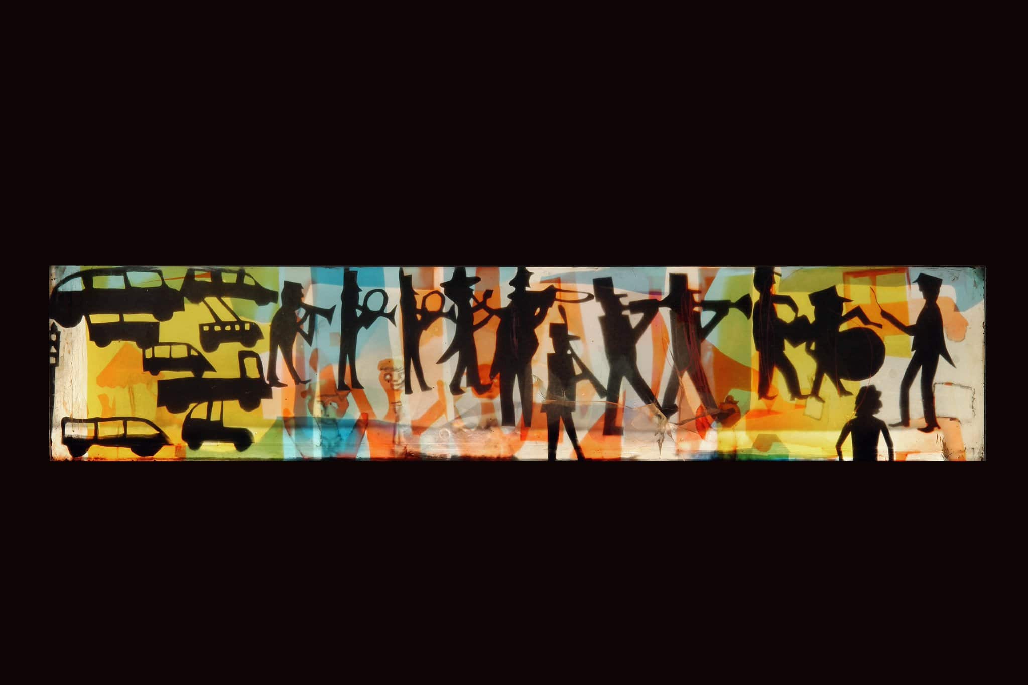 Une fanfare défile devant une foule de spectateurs et des voitures qui les suivent. Le tout sur un fond bleu, orange, jaune et blanc.
