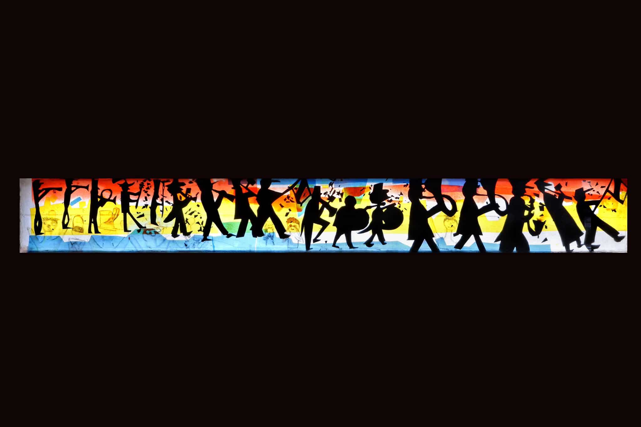Une fanfare de dix-sept musiciens défile devant quelques spectateurs. Le tout sur un fond bleu, orange, jaune et blanc.