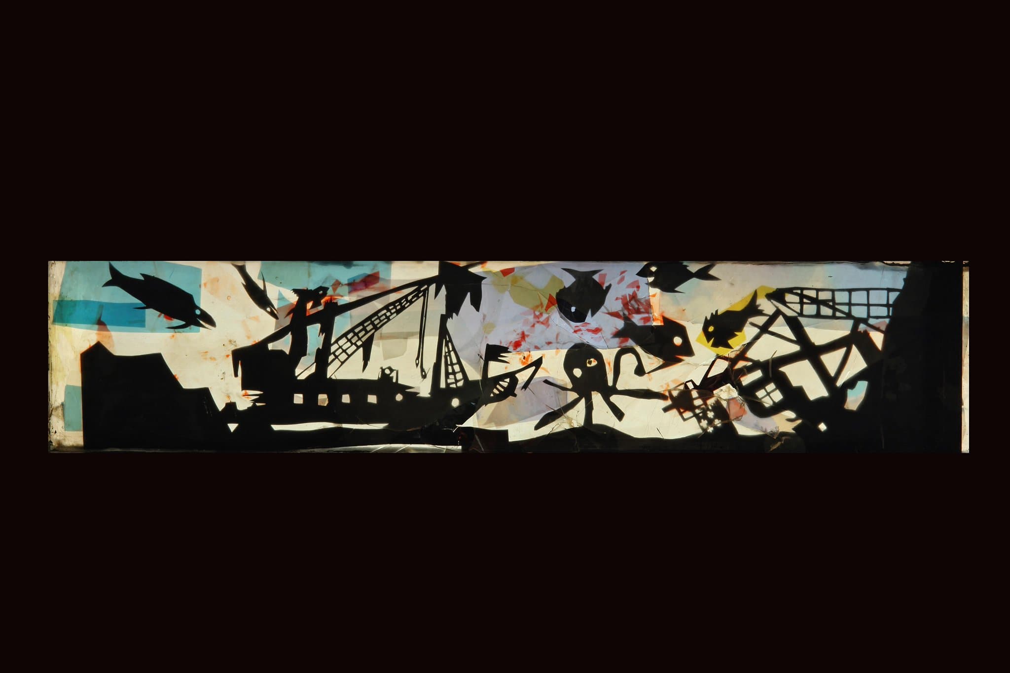 Une remorqueur et un phare brisé sont abandonnés au fond de l’eau. Autour nagent quelques poissons et une pieuvre. Le tout sur fond bleu et blanc avec quelques touches de jaune et d’orange.