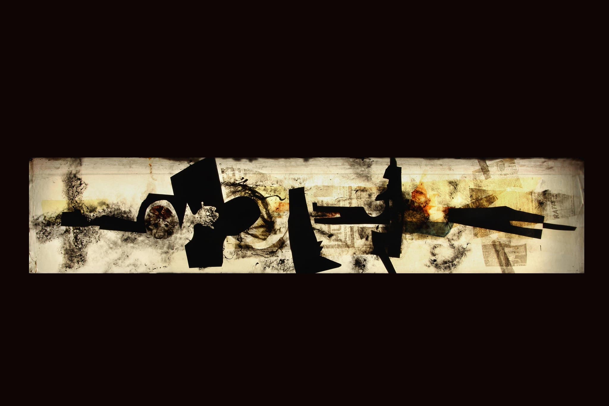 Un soldat, un fusil à la main, vient de tirer sur un homme à chapeau couché au sol. Le tout sur un fond blanc tacheté de noir et couvert de coupures de journaux.