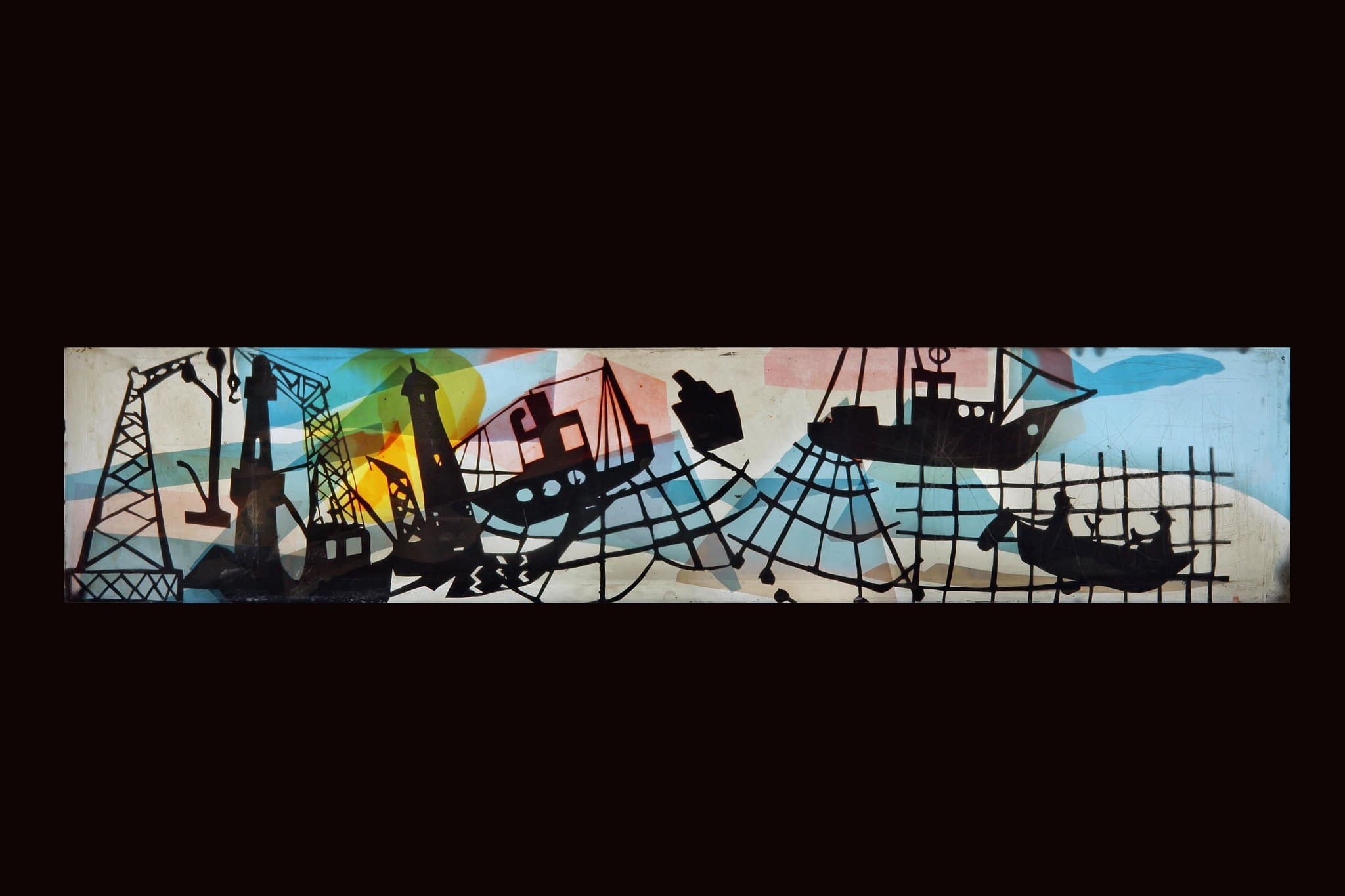Trois remorqueurs, deux grues, un phare, un navire flottent sur les eaux alors que deux pêcheurs dans une barque posent leurs filets. Le tout sur fond bleu, jaune orange et blanc.