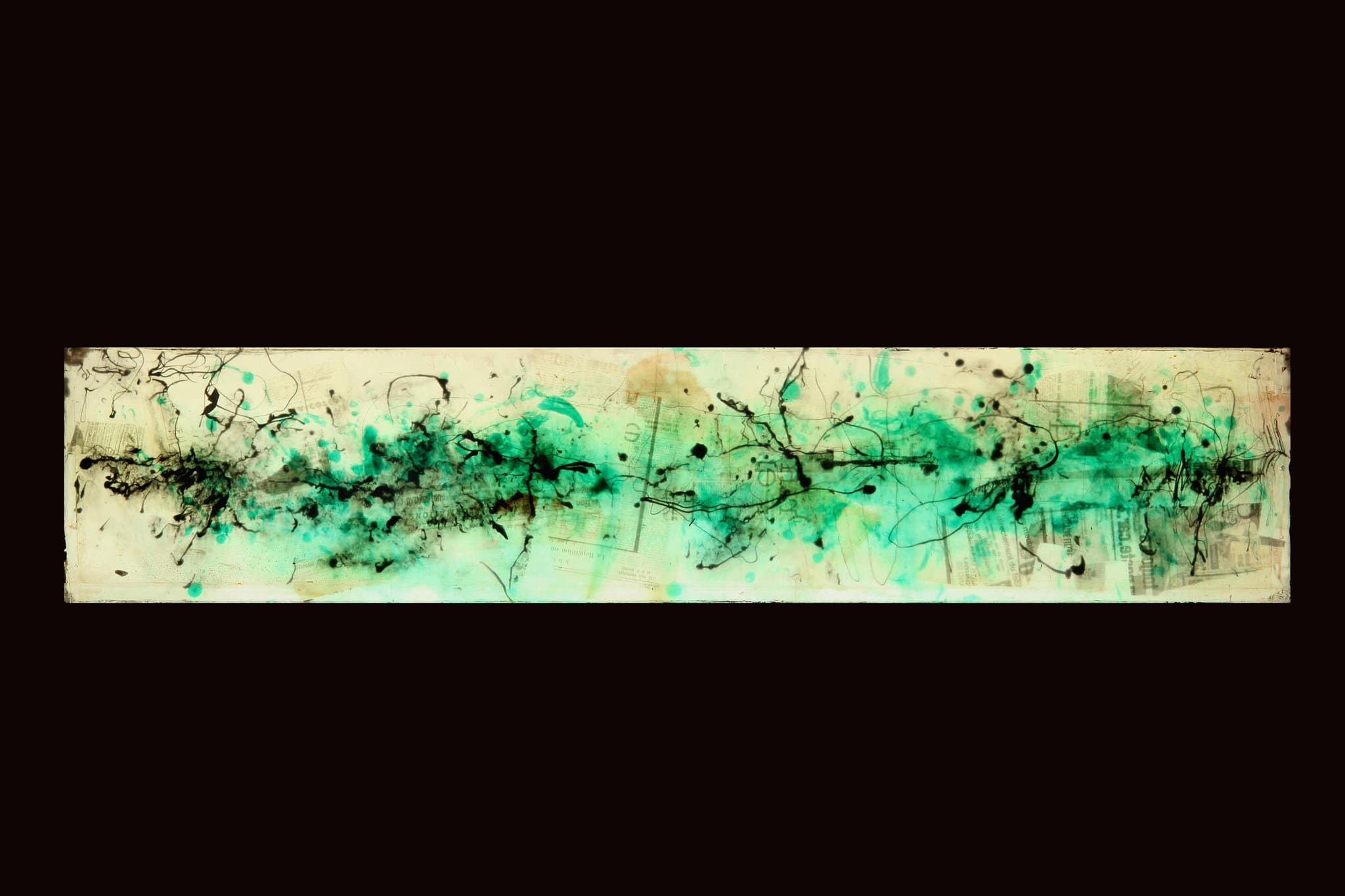 Un dessin et des lignes noires sur un décor vert sur fond blanc couvert de coupures de journaux.