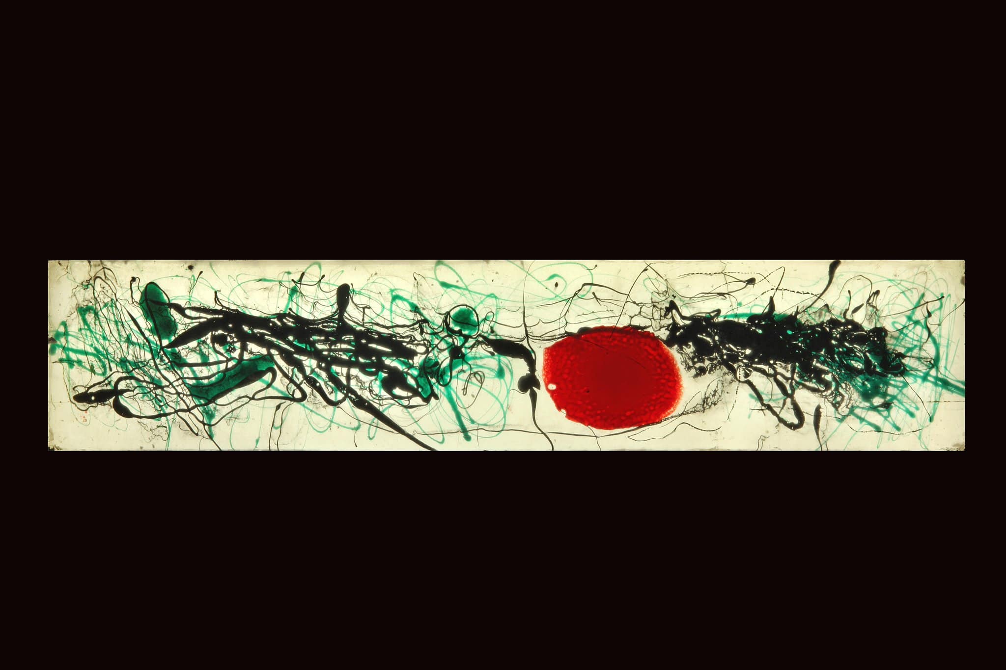 Un dessin de lignes et taches noires et vertes sur un fond blanc. Au centre une grande tache rouge.