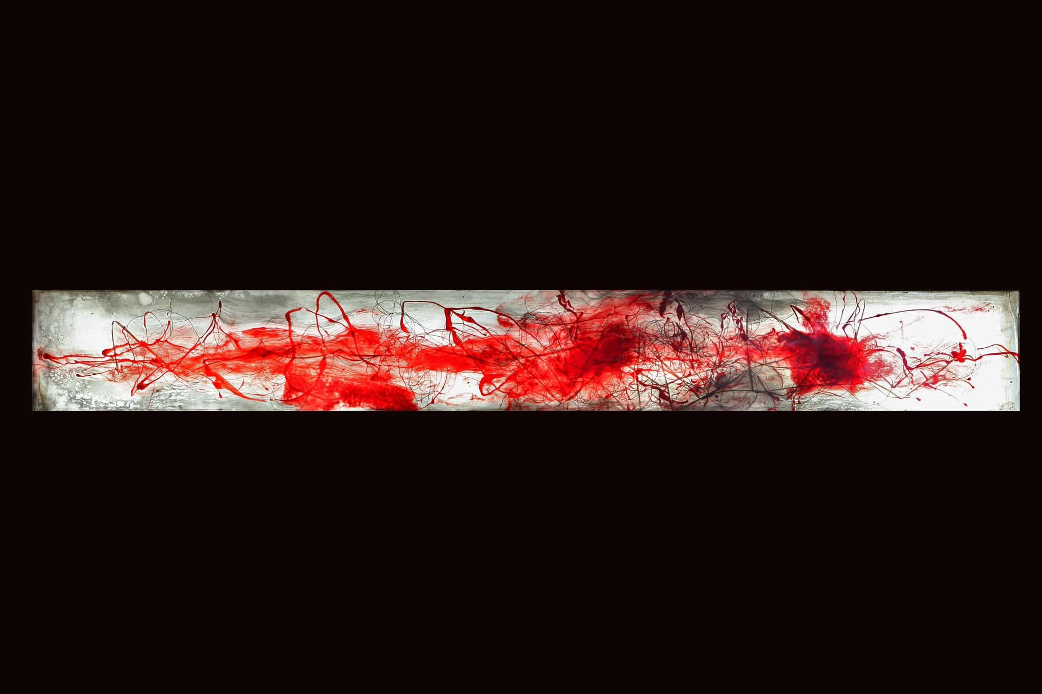 Un dessin de lignes et taches rouges sur un fond blanc et noir.