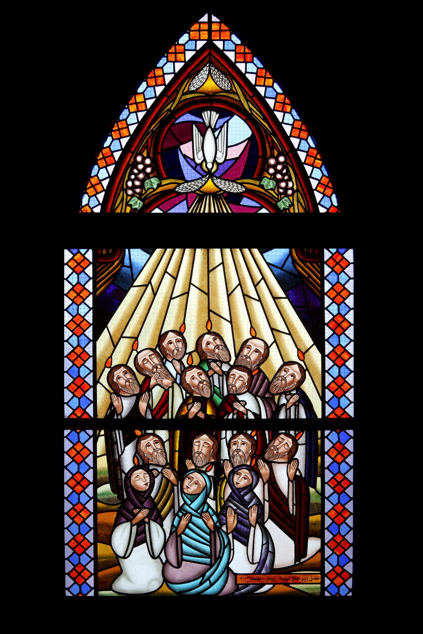 Douze apôtres debout ou agenouillés, les mains sur le coeur ou ouvertes, reçoivent l’Esprit Saint descendant du ciel sous la forme de langues de feu. Ils sont accompagnés de la Vierge entourée de deux femmes. Au sommet, la colombe entourée de ceps de vigne avec des grappes de raisin. Une large bordure géométrique bleue et rouge encadre le vitrail.