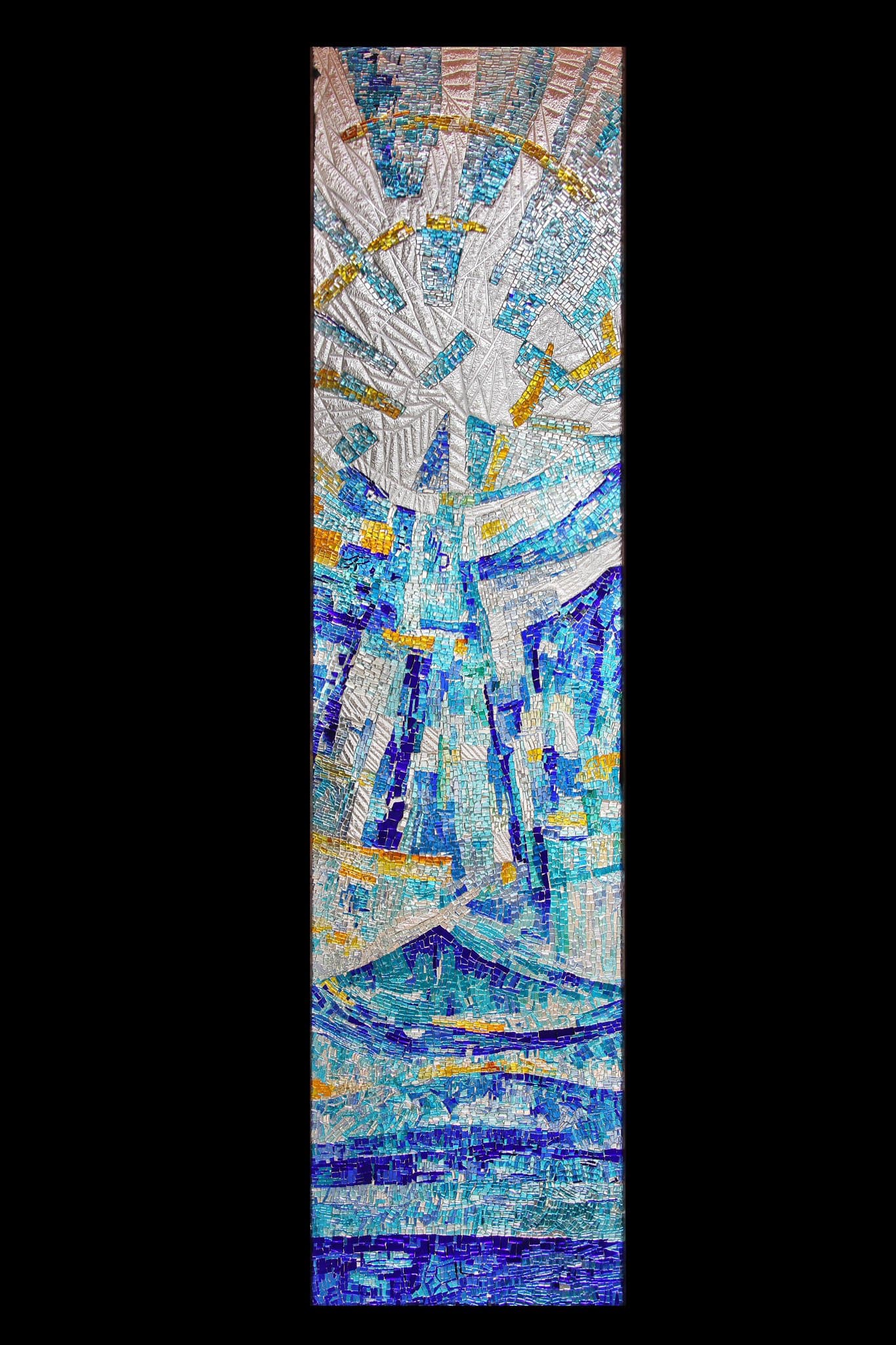 L’étoile du matin en verre blanc gravé s’élève sur un fond de mosaïque dans les teintes bleues, blanches avec quelques touches de jaune.