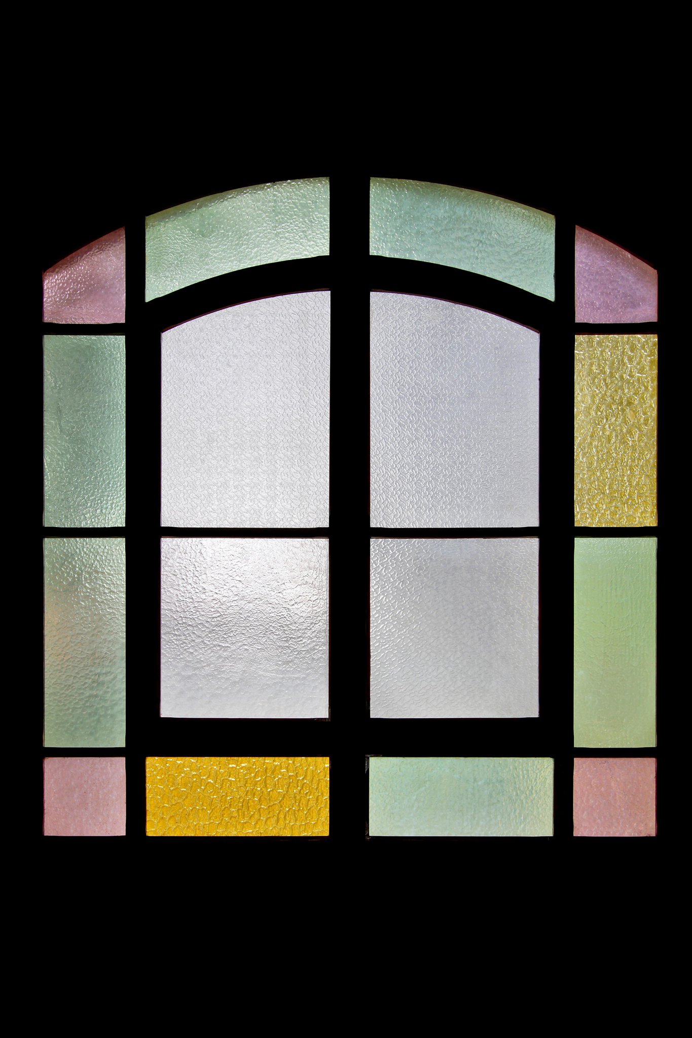 Vitrail composé de verre cathédrale avec une bordure jaune, verte et rose.
