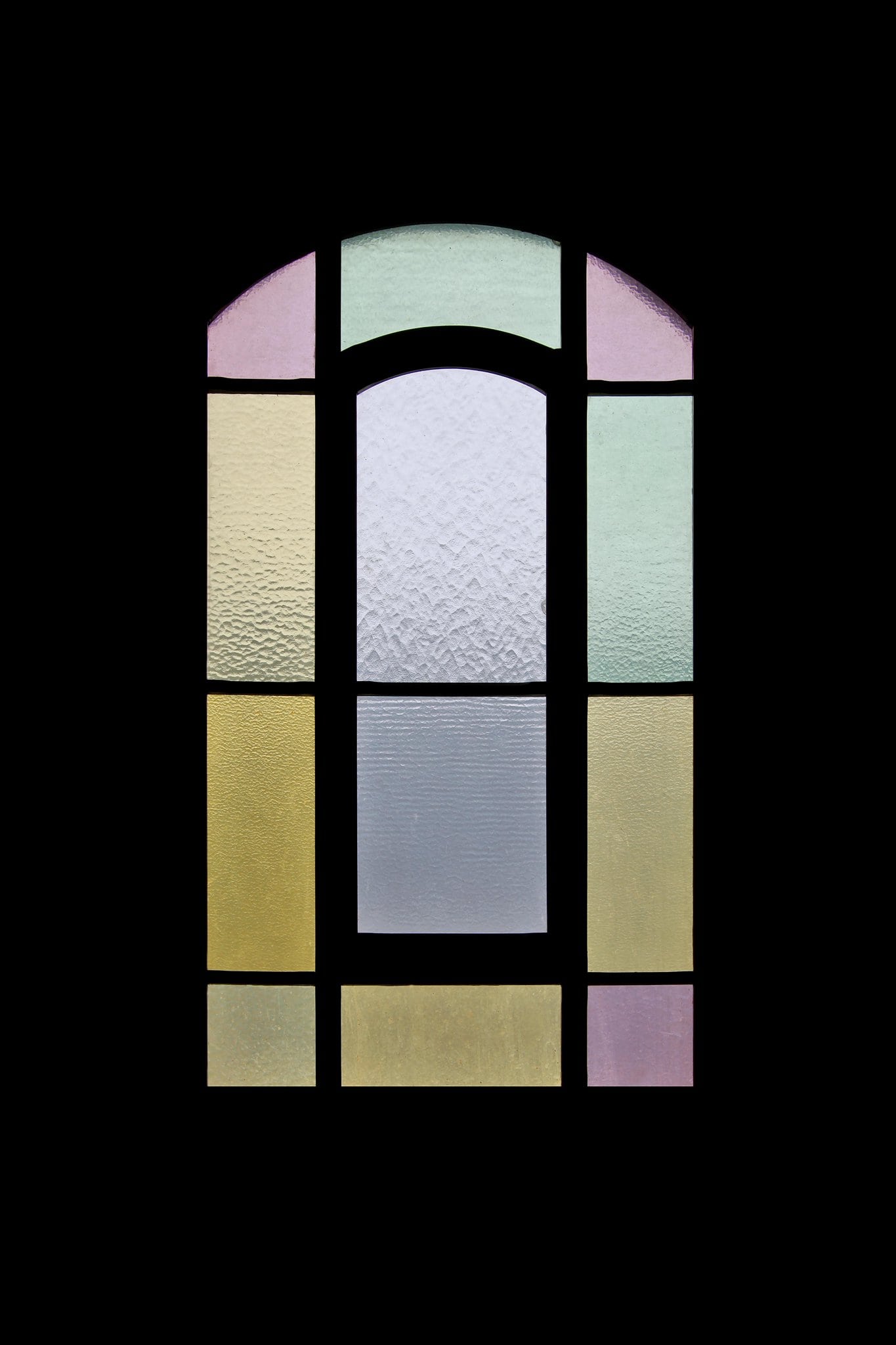 Vitrail composé de verre cathédrale avec une bordure jaune, verte et rose.