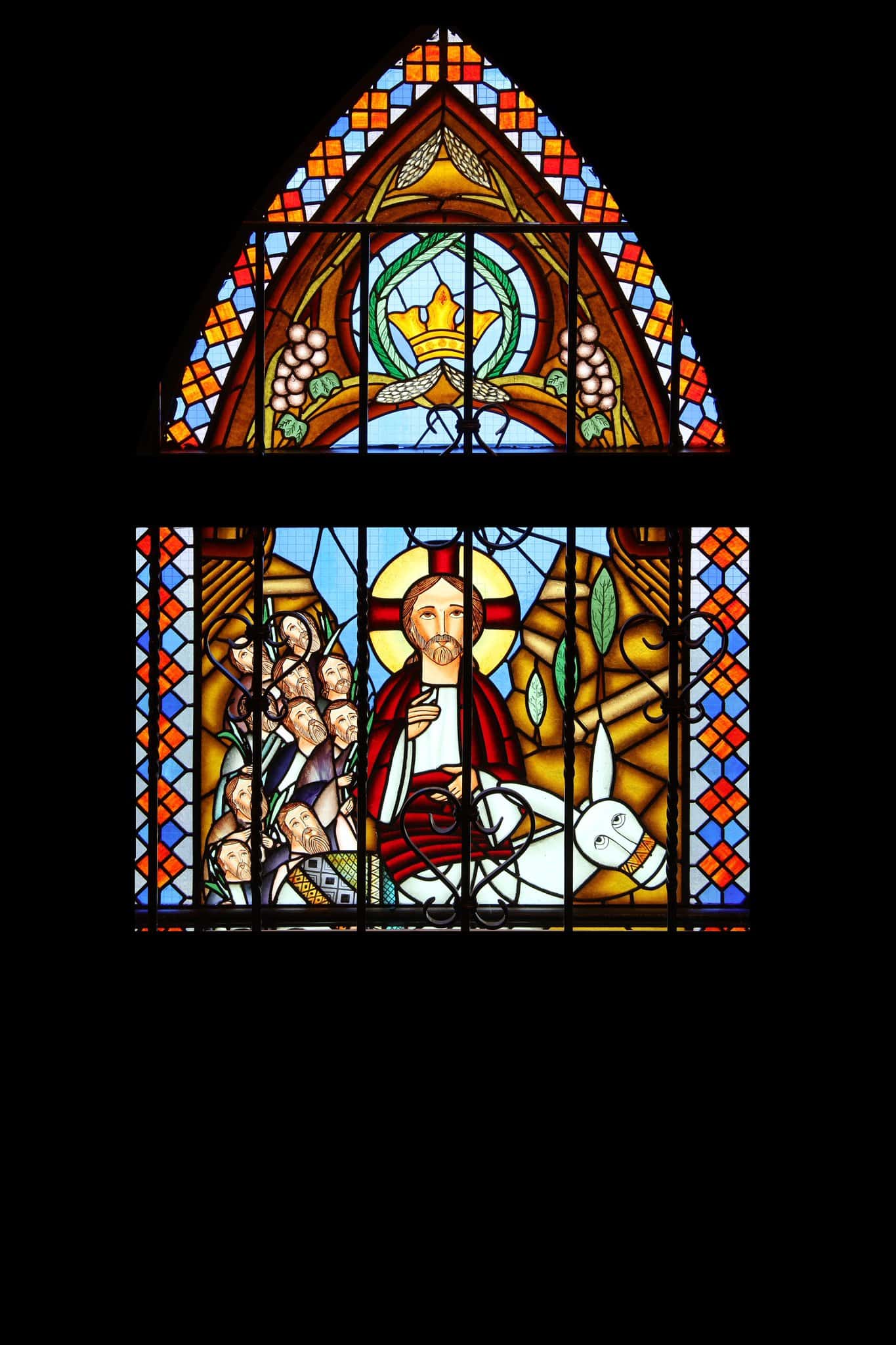 Le Christ sur son âne entre à Jérusalem acclamé par une foule tenant dans ses mains la palme du martyre. Il fait le signe de la bénédiction.
