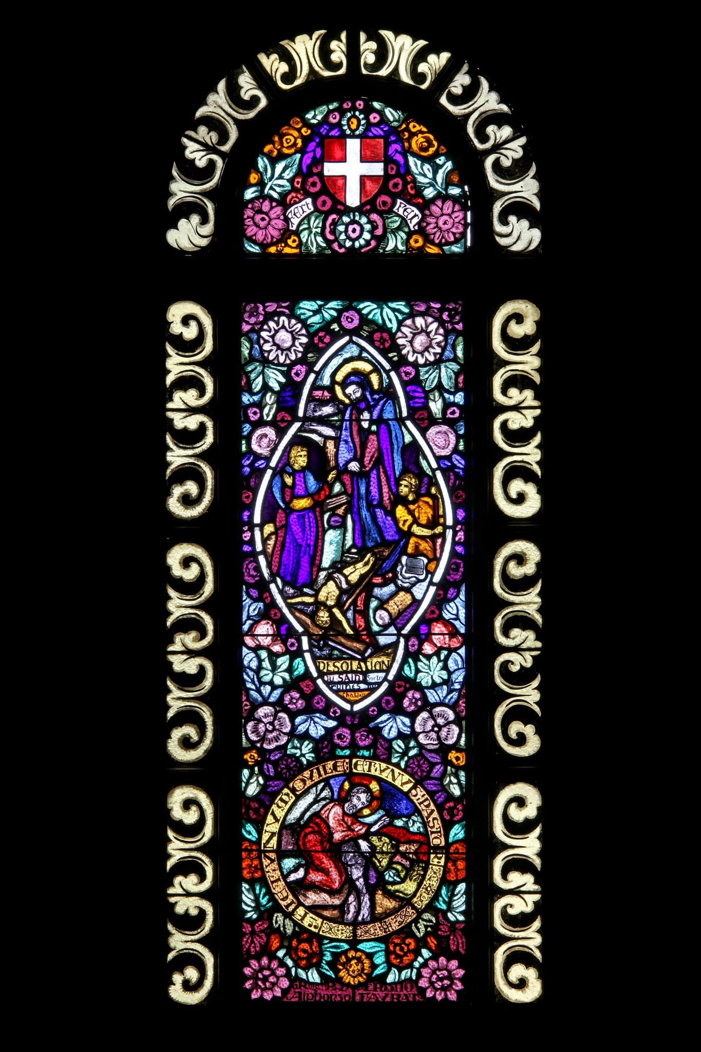 En haut, les armoiries de la Savoie. Au centre, François de Sales, accompagné de son cousin Louis de Sales, découvre les ruines d’une église dans le Chablais. Derrière lui la forteresse des Allinges. En bas dans un médaillon, le bon berger.