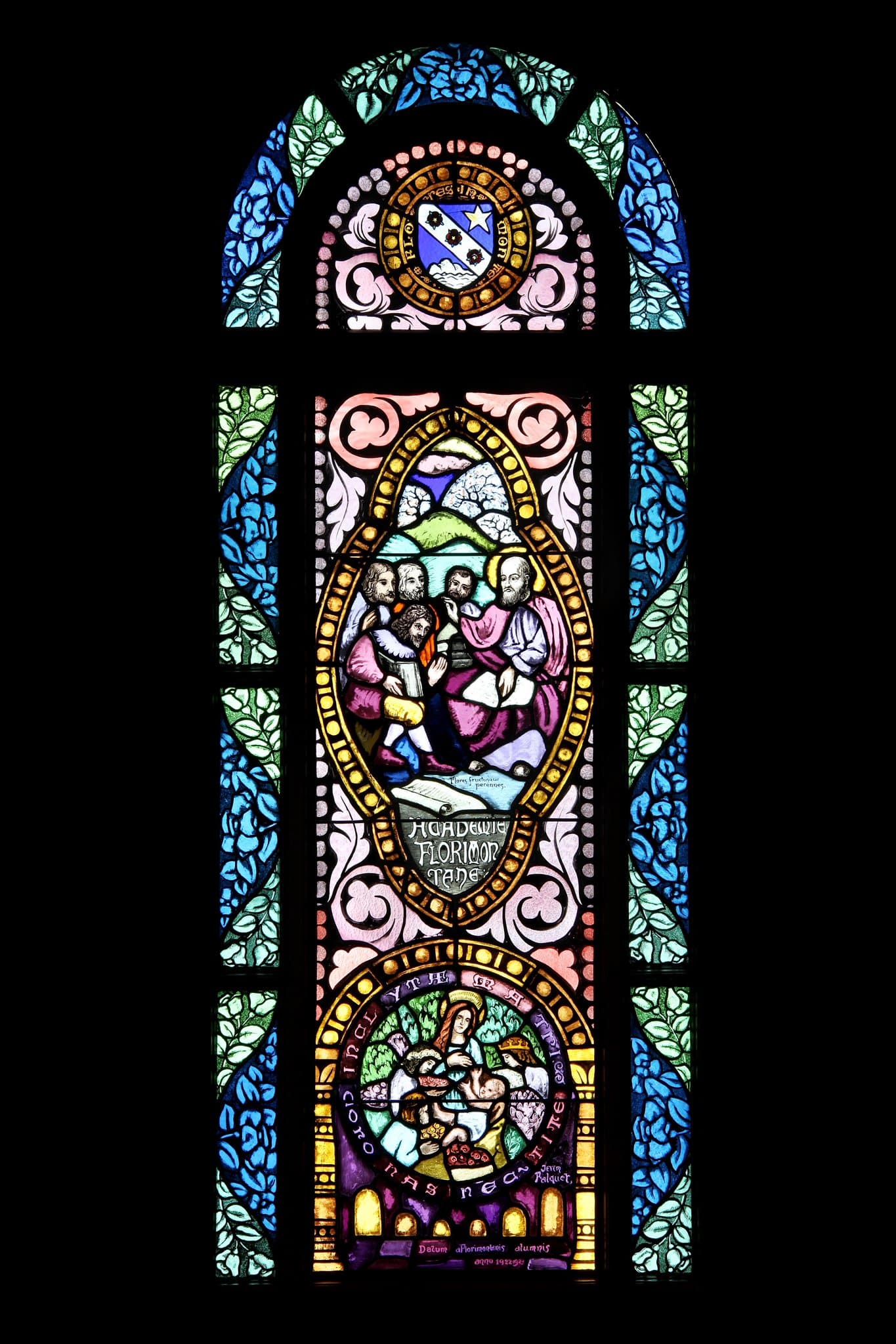 FLO/ RES/ IN / MONTE (en haut) // Flores fructusque / perennes.// ACADEMIE / FLORIMON / TANE (sous la scène centrale) // InaLYTAE/ MATRI / coroo / nAS nec TITE (médaillon en bas) // Datum a Floriontanis alumnis / anno 1922-1923 (en bas)