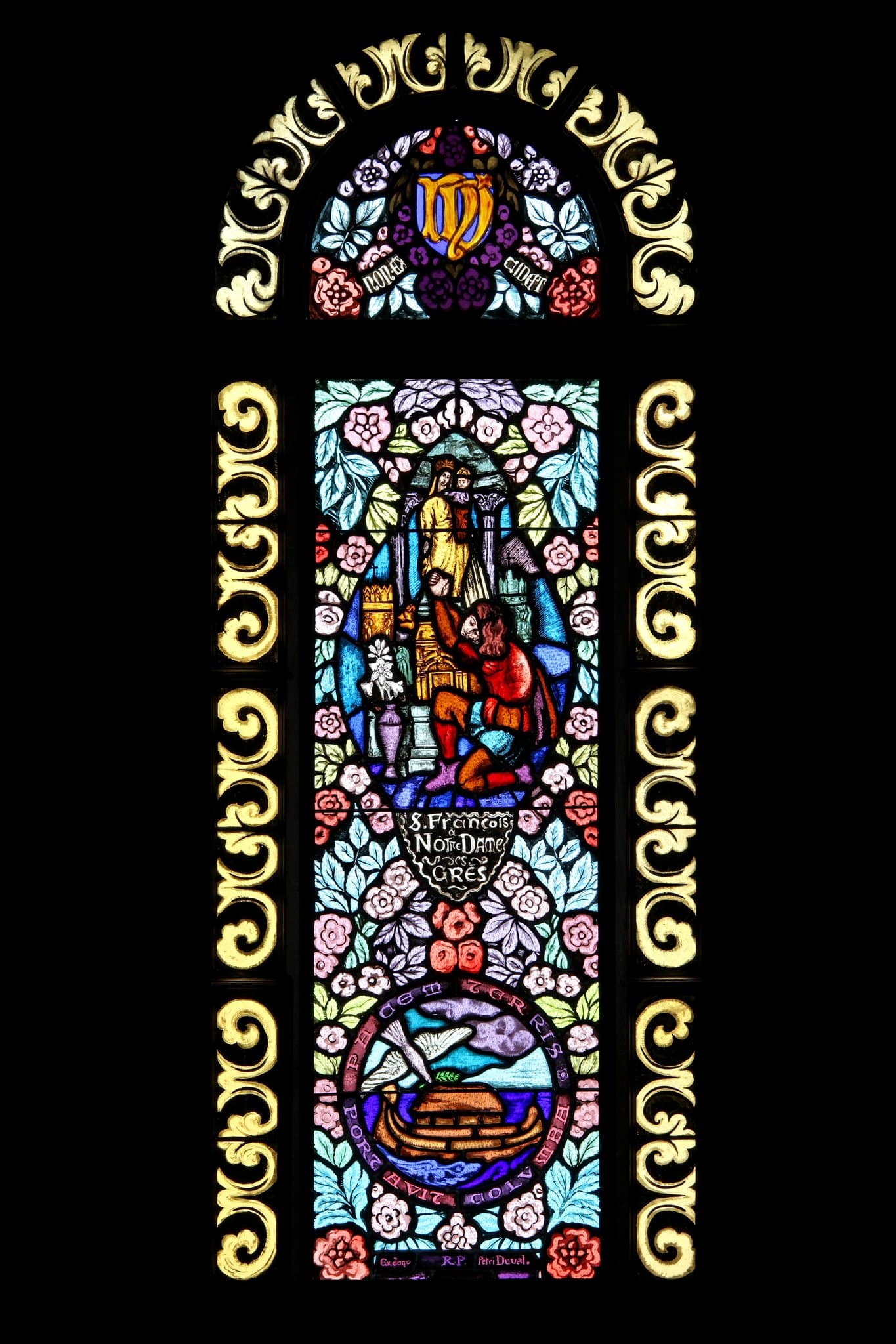 n D (en haut) // non ex / cidet (en haut) // S. François / à / Notre Dame / des / Grès (sous la scène centrale) // PACEM TERRIS / PORTAVIT COLVMBA (médaillon en bas) // Ex dono R. P. Petri Duval. (en bas)