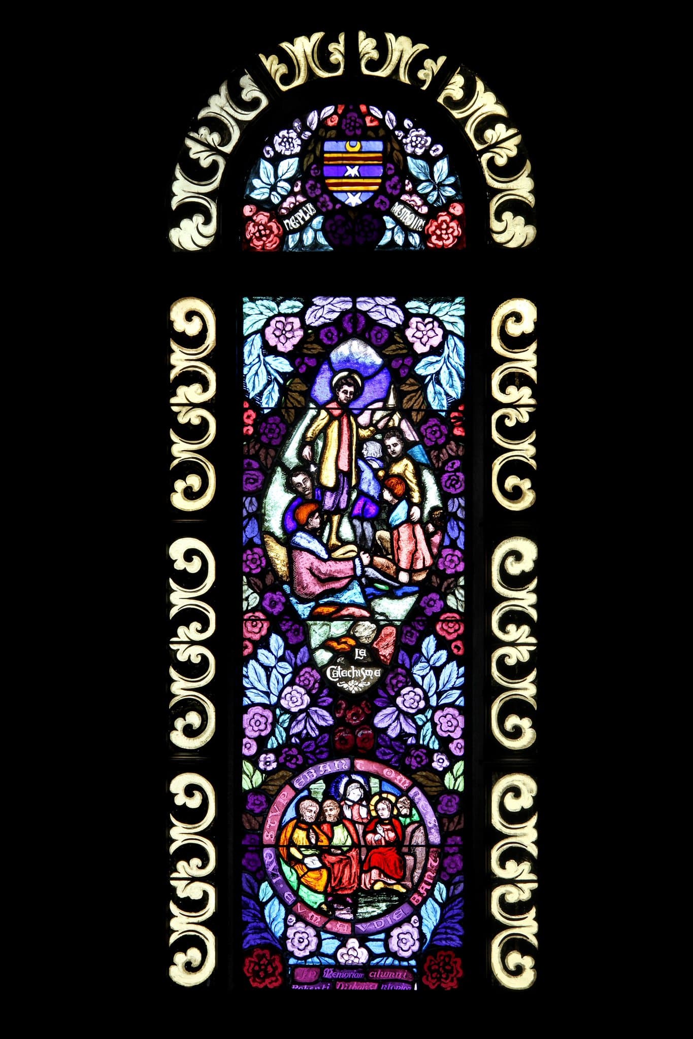 En haut, les armoiries de la famille de Sales. Au centre, François de Sales appelle ses jeunes amis au catéchisme devant l’église de Thorens. En bas dans un médaillon, Jésus au milieu des docteurs.