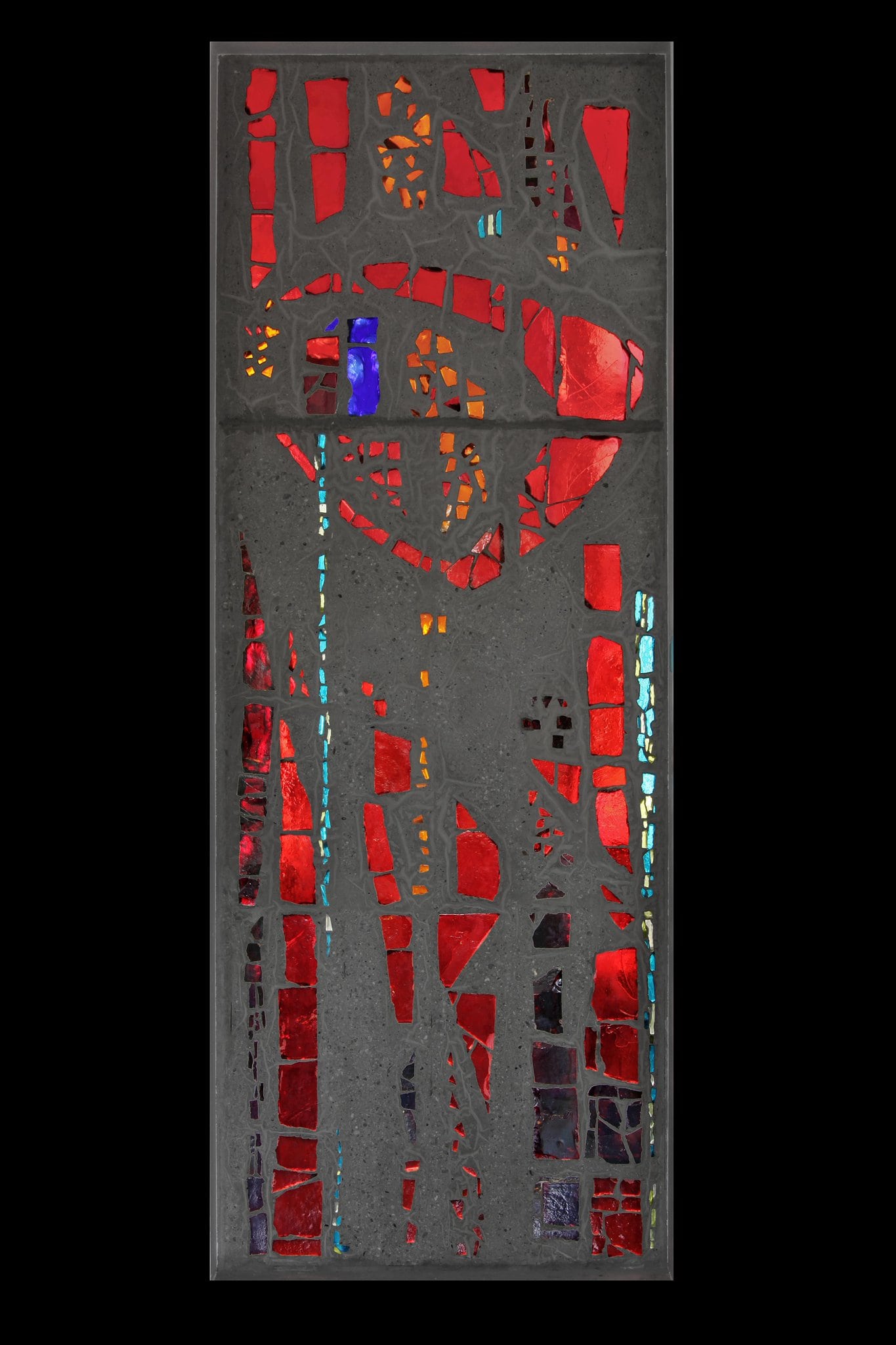 Dalle de verre non figurative avec des dessins sculptés sur le béton.