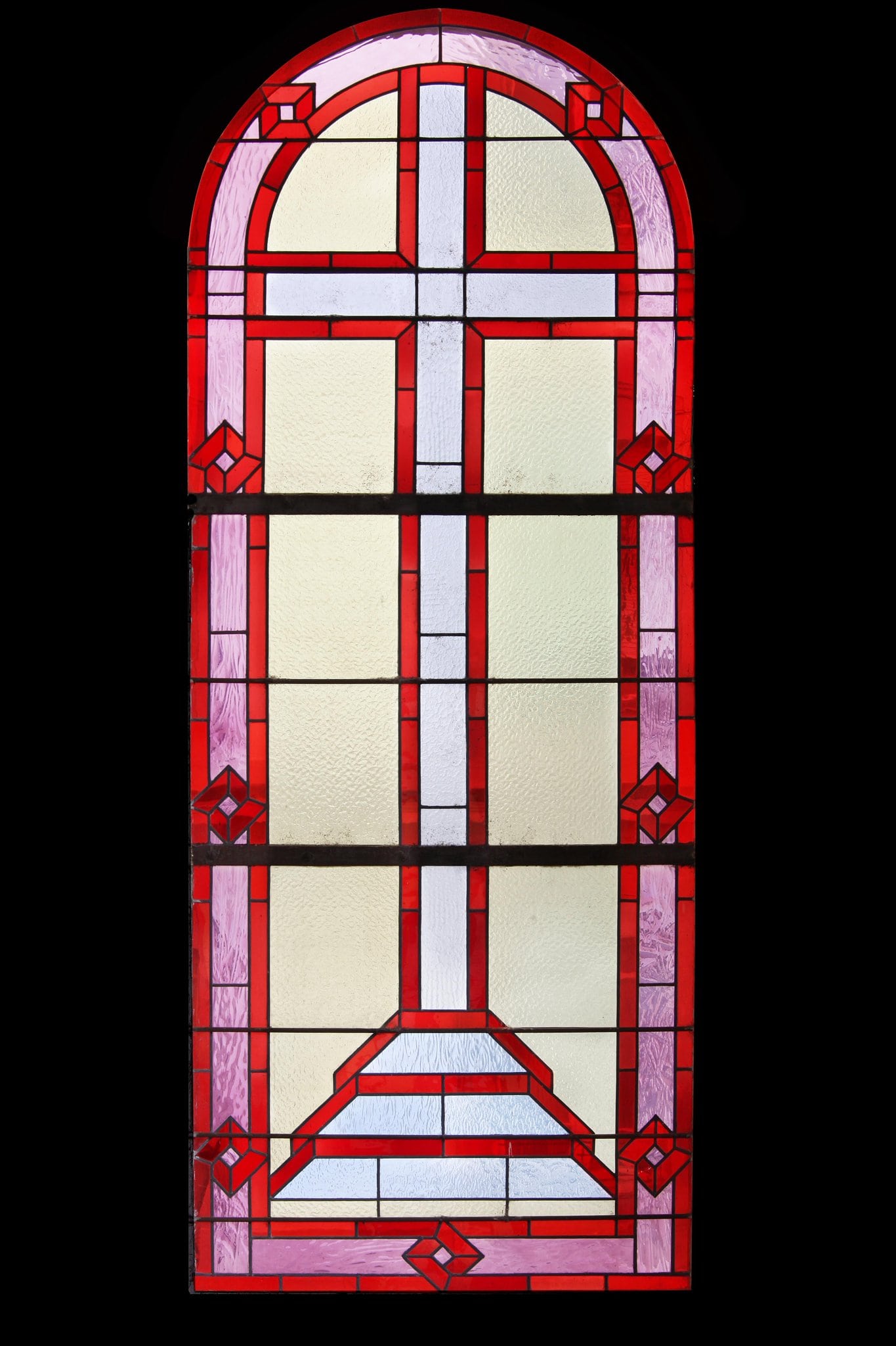 Une croix posée sur un socle à trois niveaux sur un fond jaune. Le tout encadré d’une bordure rose et rouge décorée de bornes .