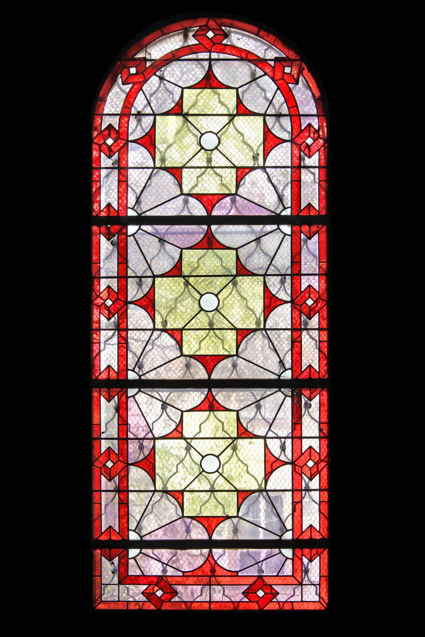 Trois croix grecques jaunes insérées dans un losange rouge et superposées sur un fond rose. Le tout encadré d’une double bordure rouge décorée de bornes.